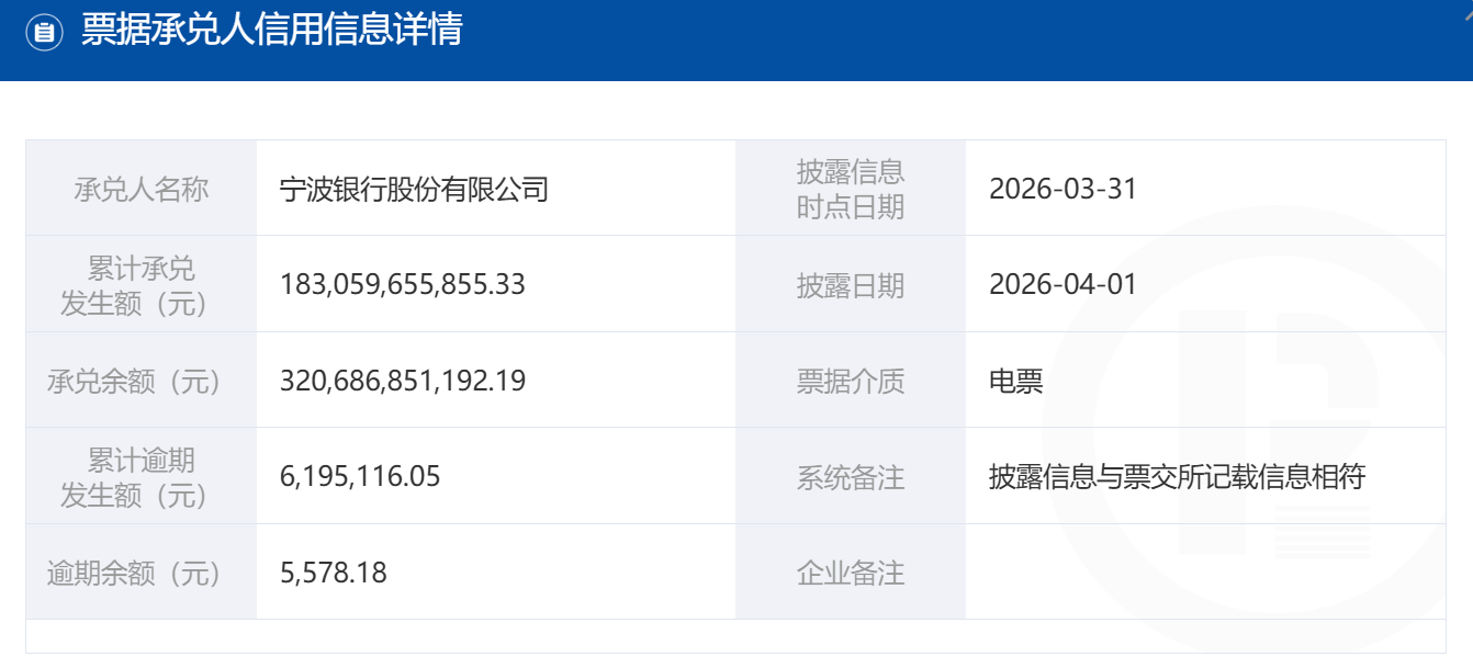 据上海票据交易所网站显示,截至3月31日,宁波银行的票据承兑余额为3206.87亿元,累计承兑发生额为1830.60亿元;票据逾期金额为5578.18元,累计逾期发生额619.51万元。