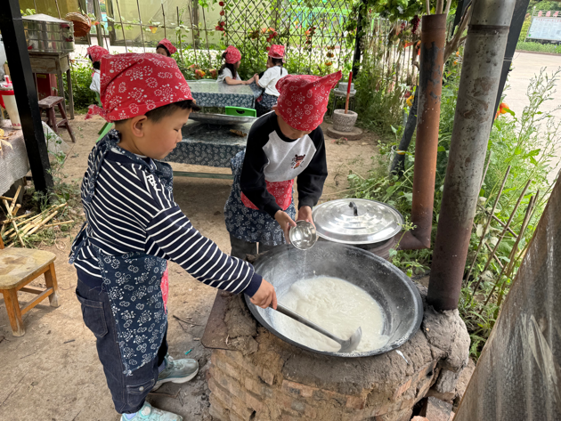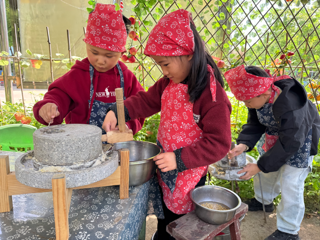 在园长妈妈的悉心指导下,小朋友化身小小匠人,开启古法做豆腐体验。孩子们两两合作,将泡好的黄豆放入石磨,合力转动磨盘,醇香的豆汁缓缓流出。随后大家使用传统摇架过滤豆汁,精细分离豆渣与豆浆,切身感受传统农具的独特魅力与古人的劳动智慧。到了豆腐定型环节,孩子们将嫩滑的豆花平整装入豆腐模具,细心整理纱布、按压模具。经过耐心静置等待,一粒粒黄豆,历经挑选、清洗、浸泡、研磨、过滤、煮沸、点卤、压制,最终变成了方方正正的新鲜豆腐。