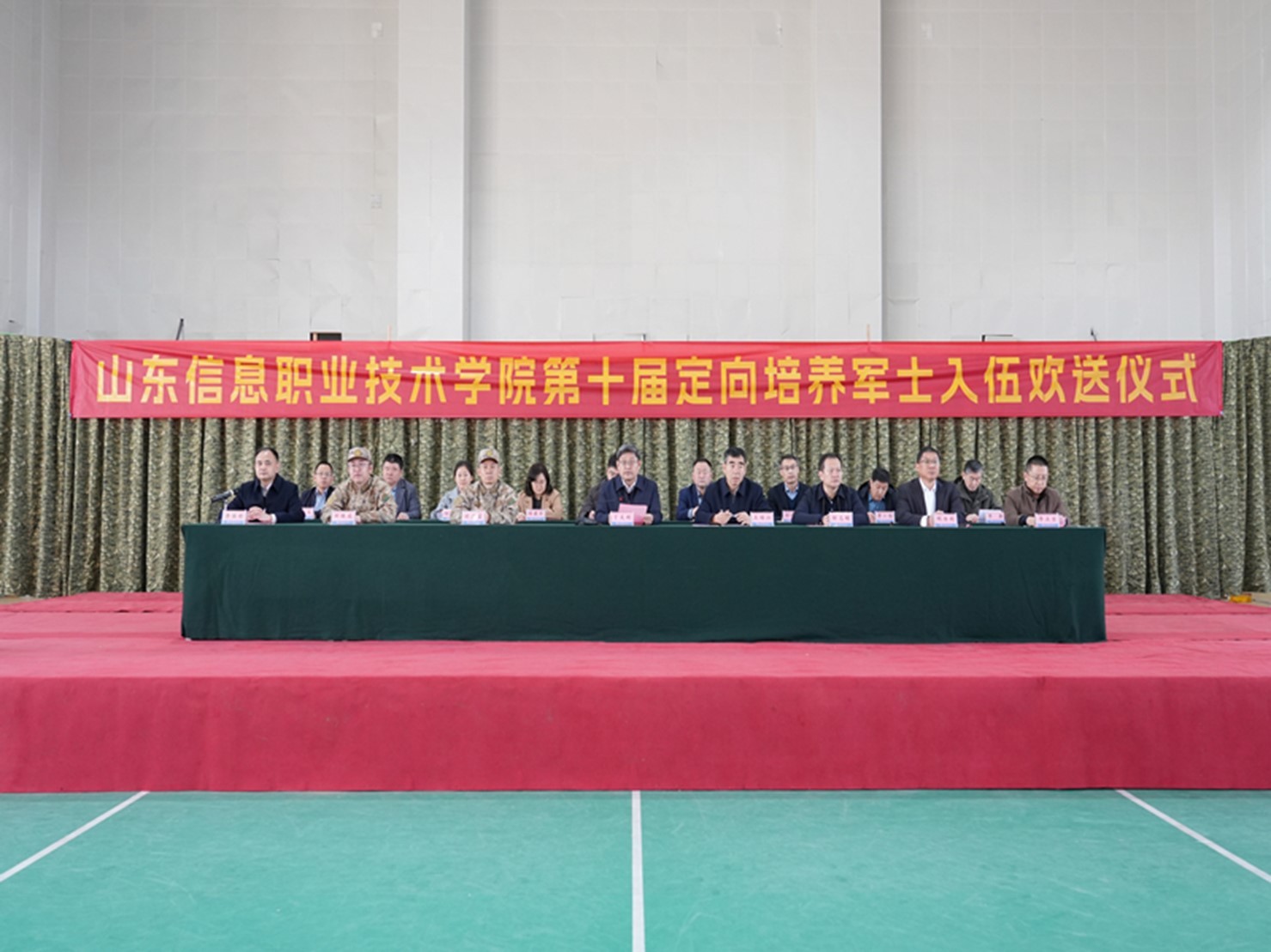 近日,山东信息职业技术学院在滨海校区体育馆举行第十届定向培养军士入伍欢送仪式。潍坊市奎文区委常委、武装部上校政治委员刘广富,滨海区党工委委员、公安分局党委书记、局长王培江,山东(潍坊)海洋科技大学园管理办公室党组成员、副主任邹志刚出席仪式,山东信息职业技术学院党委副书记、院长丁文利出席仪式并讲话,部队接兵干部郑铁成、其他在校学校领导、学校相关部门负责人、士官学院全体入伍定向培养军士及家长代表参加仪式。