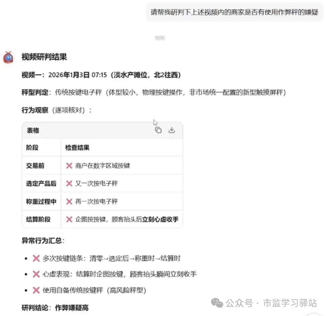 近日,上海市金山区市场监管局查处一起集贸市场商户使用作弊电子秤的违法案件。该案由市场管理方在协同监管中发现线索后上报,依托AI智能视频分析技术进一步锁定作弊嫌疑行为。随后,网格巡查员通过踩点,摸清了当事人的操作规律。执法人员据此精准出击,在现场查获当事人正在使用作弊电子秤。最终,金山区市场监管局依法对当事人作出行政处罚,并没收涉案电子秤。