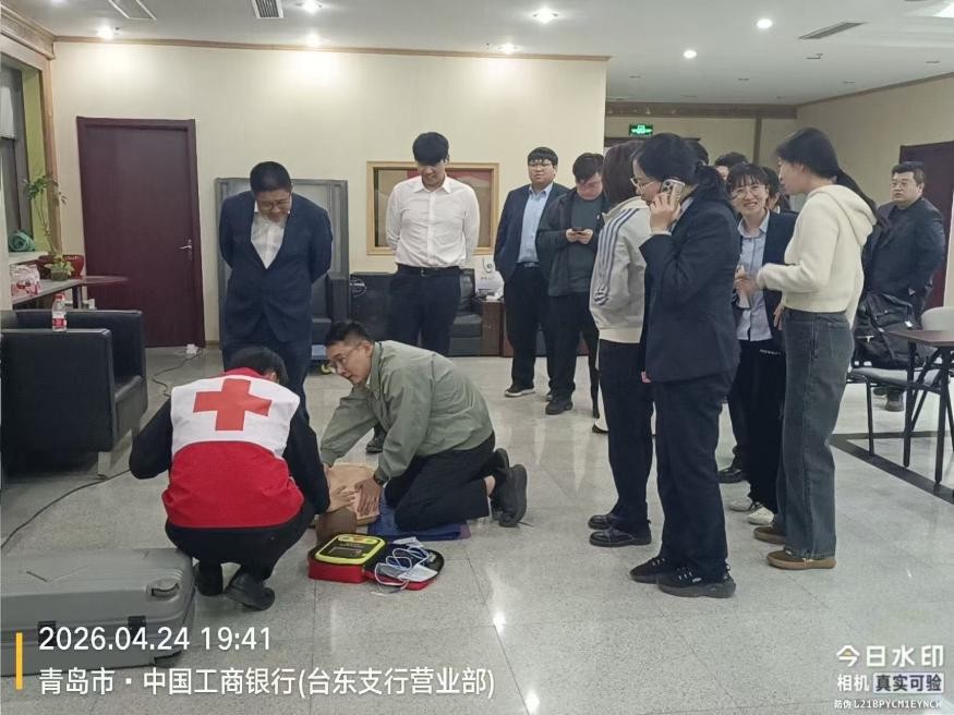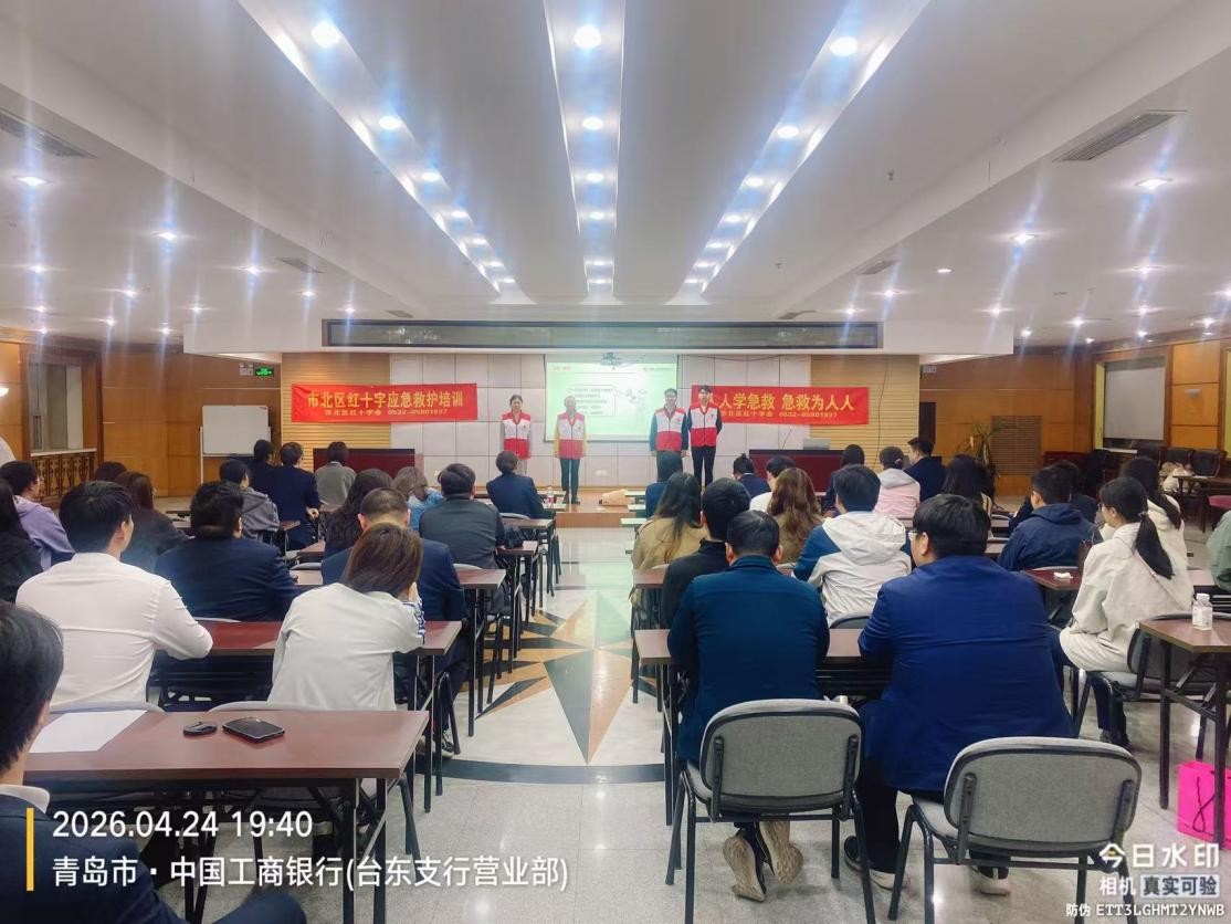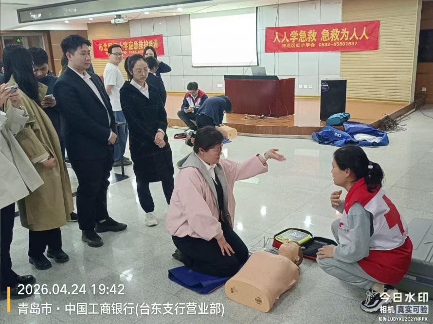 为进一步普及应急救护知识,提升驻街单位工作人员应对突发心脏骤停等紧急情况的处置能力,切实筑牢辖区公共场所生命安全防线,近日,青岛市市北区台东街道红十字会在区红十字会的大力协助下,邀请专业急救培训机构走进辖区驻街单位中国工商银行台东支行,开展AED(自动体外除颤器)使用及应急救护专题培训,银行一线柜员、客户经理、安保人员等50多位员工参与此次培训。市北区红十字会副会长、台东街道红十字会副会长亲临工商银行会议室听课。