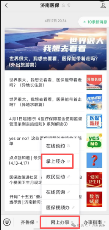 进入微信搜索“济南医保”小程序,或“济南医保”微信公众号→网上办事→掌上经办进入。