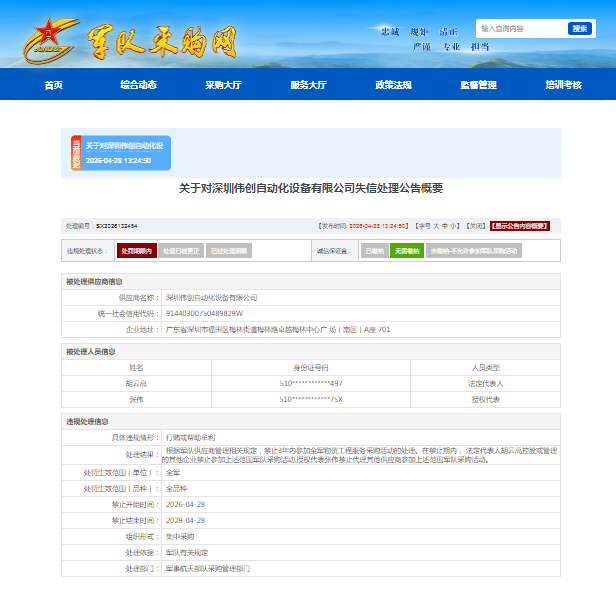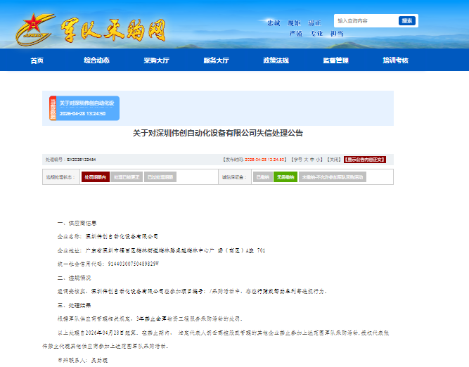 失信处理公告显示,深圳伟创的违规情况为:存在行贿或帮助牟利等违规行为。根据军队供应商管理相关规定,处理部门对其作出“3年禁止全军物资工程服务采购活动”的处罚。以上处理自2026年4月28日起算。