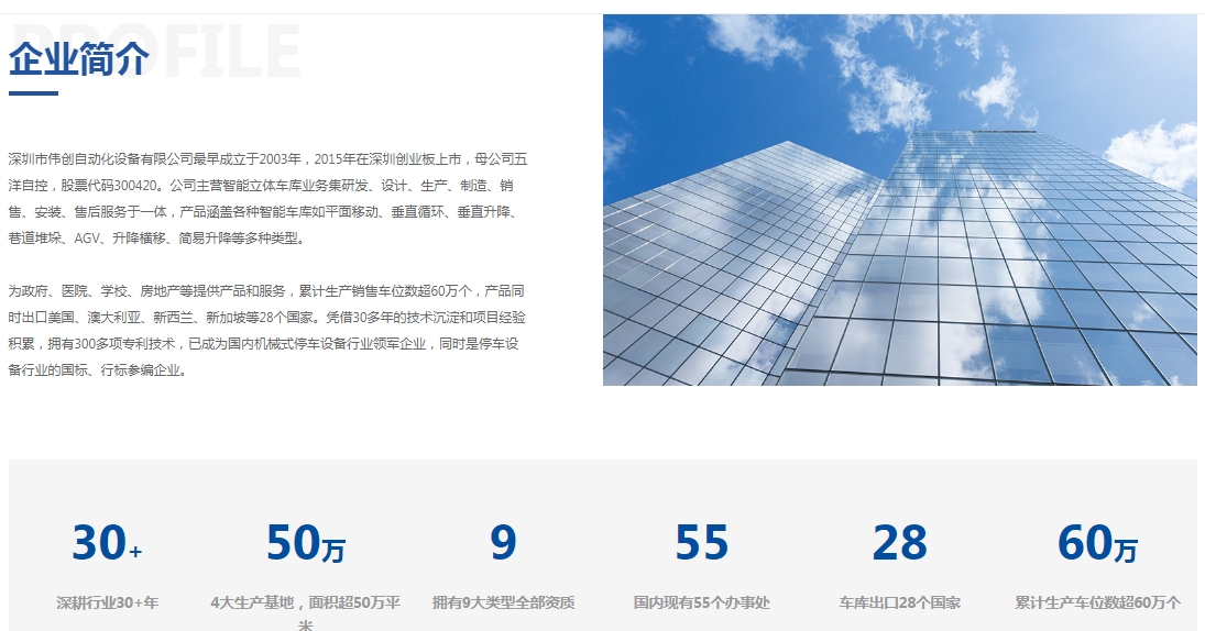 深圳伟创官方网站介绍,公司最早成立于2003年,2015年在深圳创业板上市,母公司五洋自控,股票代码300420。公司主营智能立体车库业务集研发、设计、生产、制造、销售、安装、售后服务于一体,产品涵盖各种智能车库如平面移动、垂直循环、垂直升降、巷道堆垛、AGV、升降横移、简易升降等多种类型。