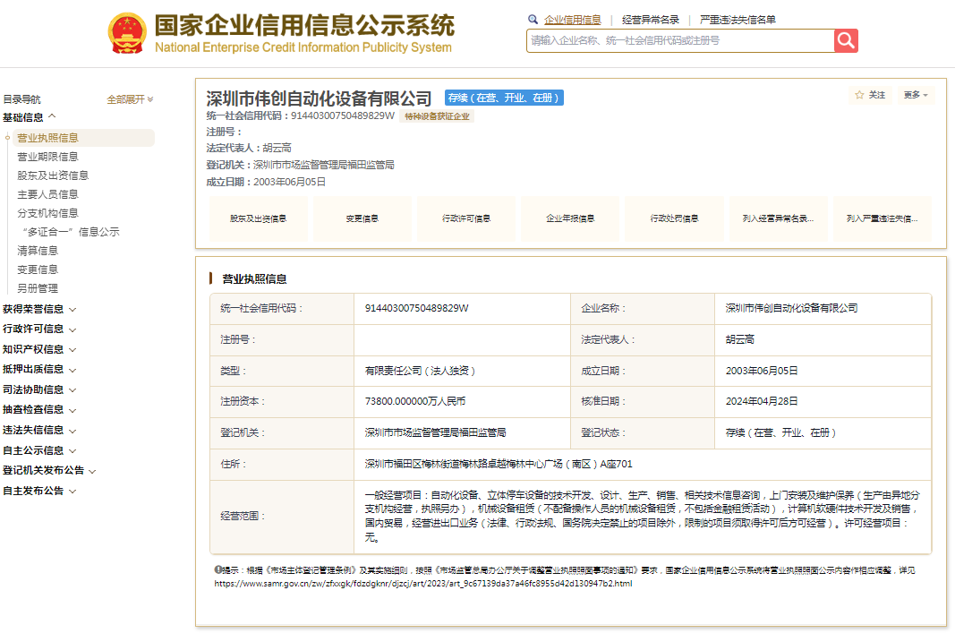 国家企业信用信息公示系统显示,深圳市伟创自动化设备有限公司成立于2003年,法定代表人胡云高,注册资本73800万元人民币,由五洋自控(300420.SZ)全资持股。