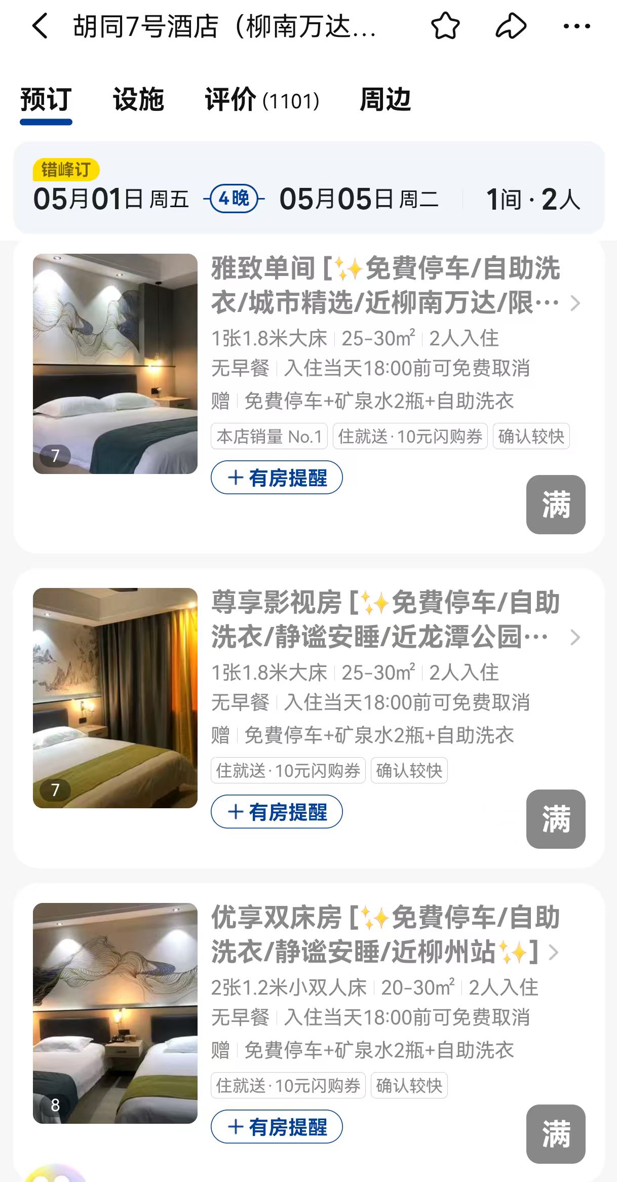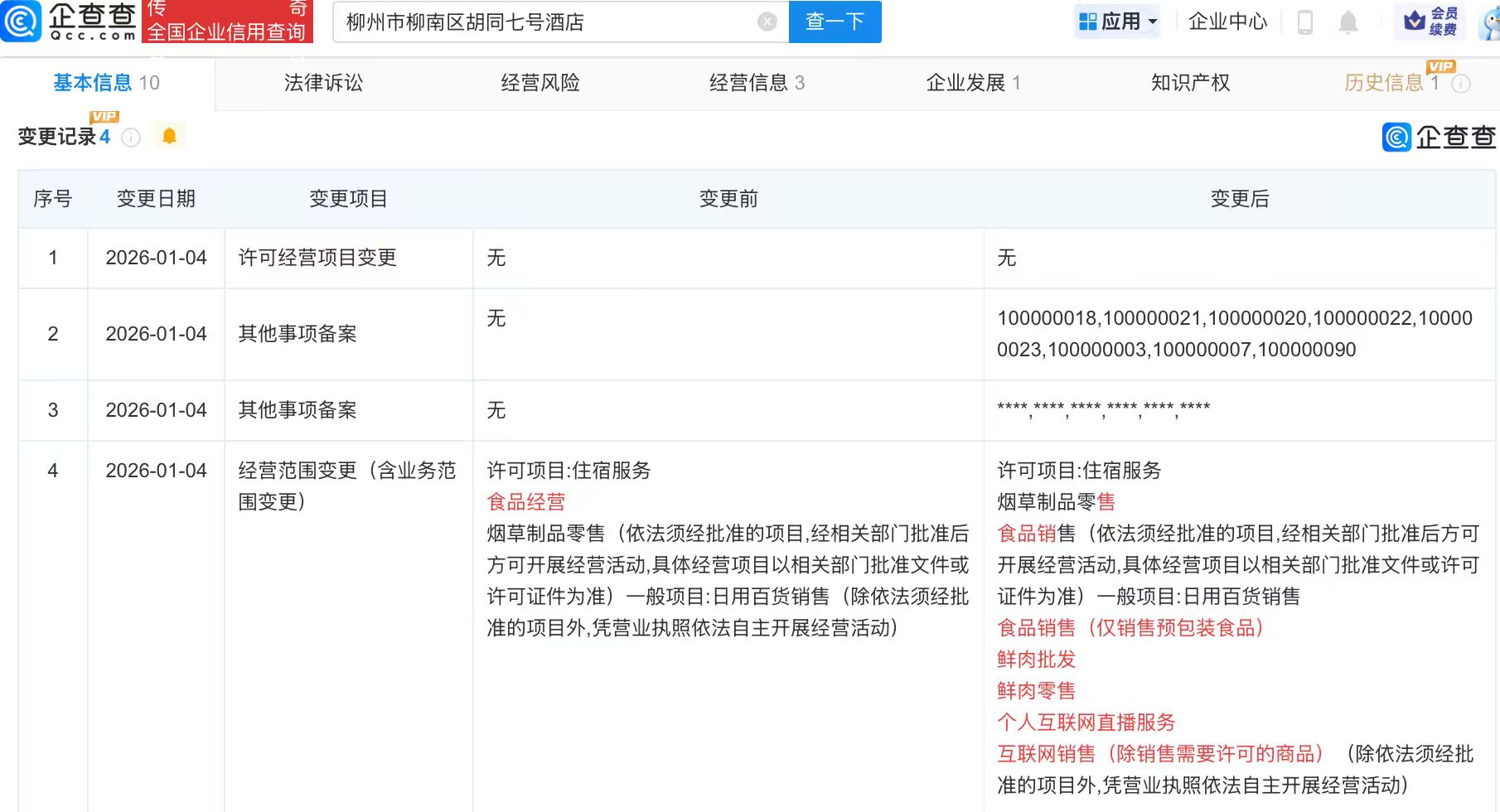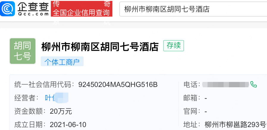 企查查APP显示,涉事酒店柳州市柳南区胡同七号酒店成立于2021年6月,资金数额20万元,今年1月,该酒店业务新增个人互联网直播服务等。另据第三方平台信息显示,该酒店五一期间房源已订满。