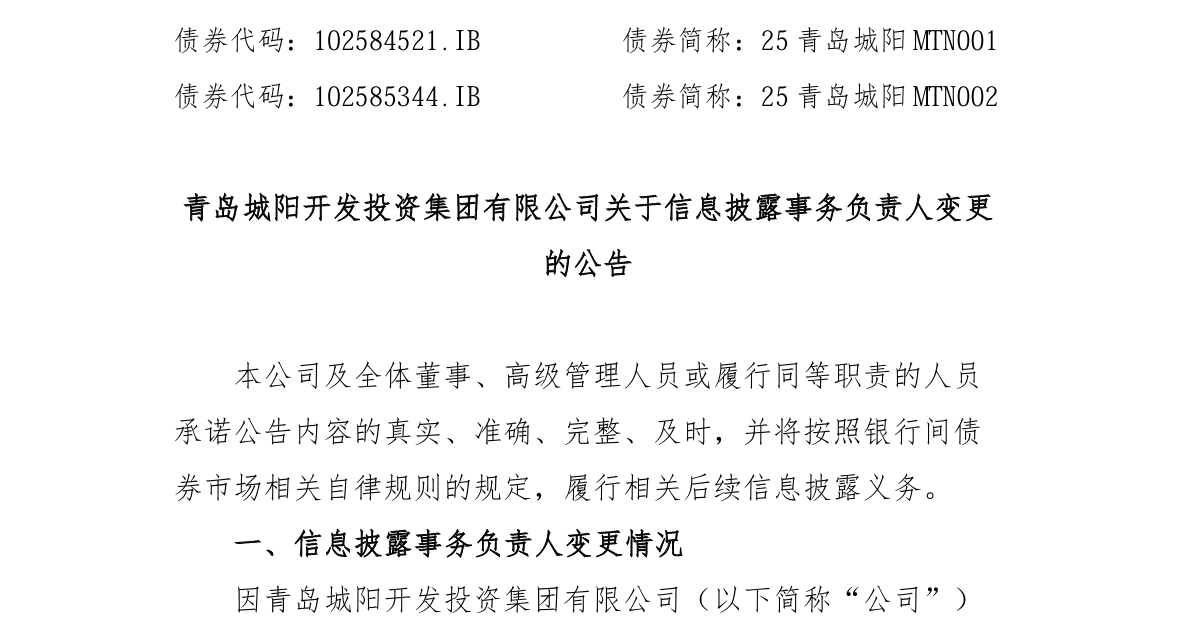 青岛城阳开投集团更换信披负责人,法定代表人胡兆辉接棒