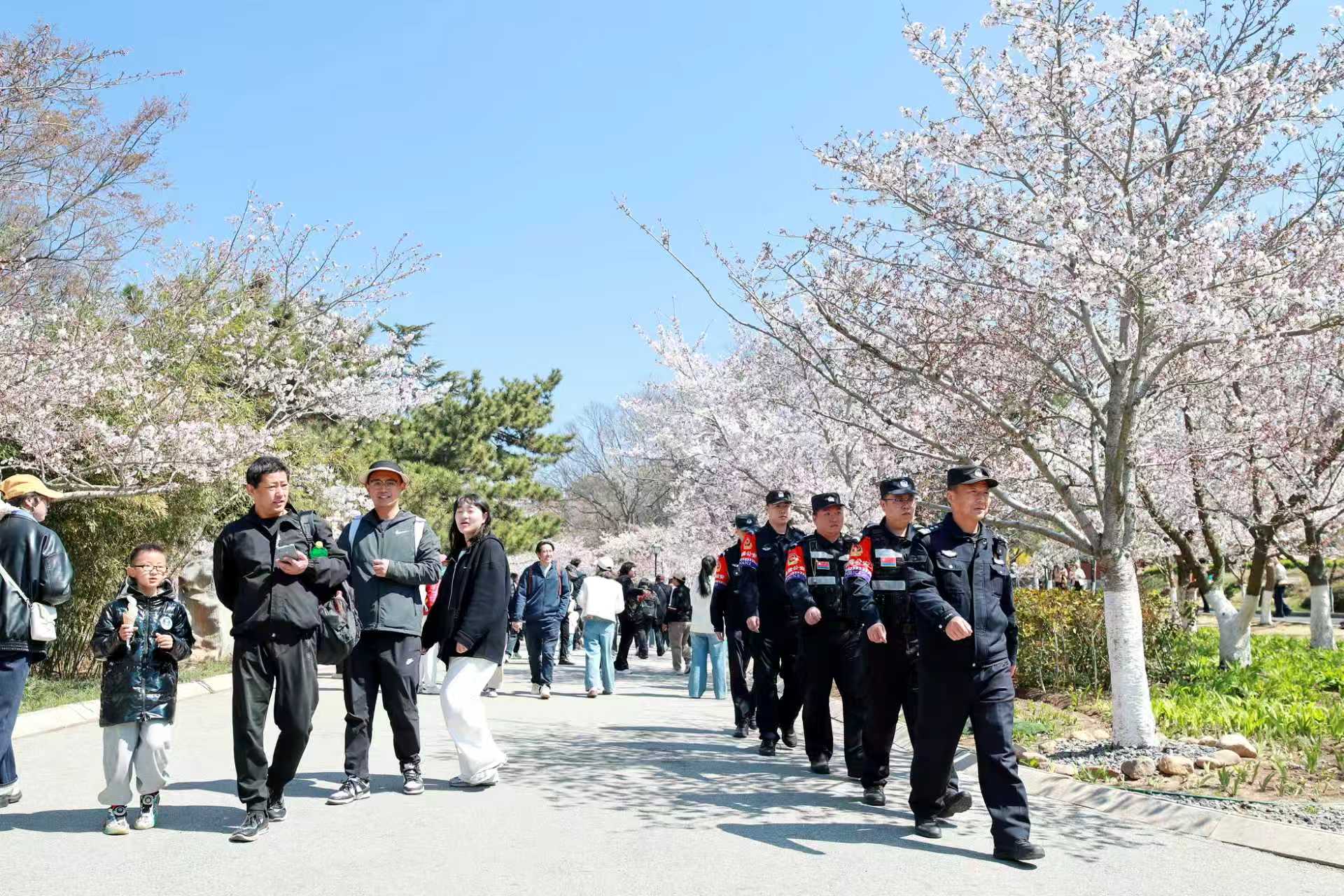 “在中国特别有安全感,随处都能见到警察,不少年轻民警还能用流利的英语为我们提供帮助。”青岛中山公园的樱花树下,一位外国游客由衷赞叹。春风拂面,樱浪如画,一年一度的中山公园樱花会如期而至,景区内游人如织。在此期间,青岛市公安局市南分局民辅警全员在岗、全时坚守,以严密的安保部署、硬核的防控措施和暖心的服务举措,全程守护景区秩序与游客安全,在花海中勾勒出最亮眼的平安“警”色。