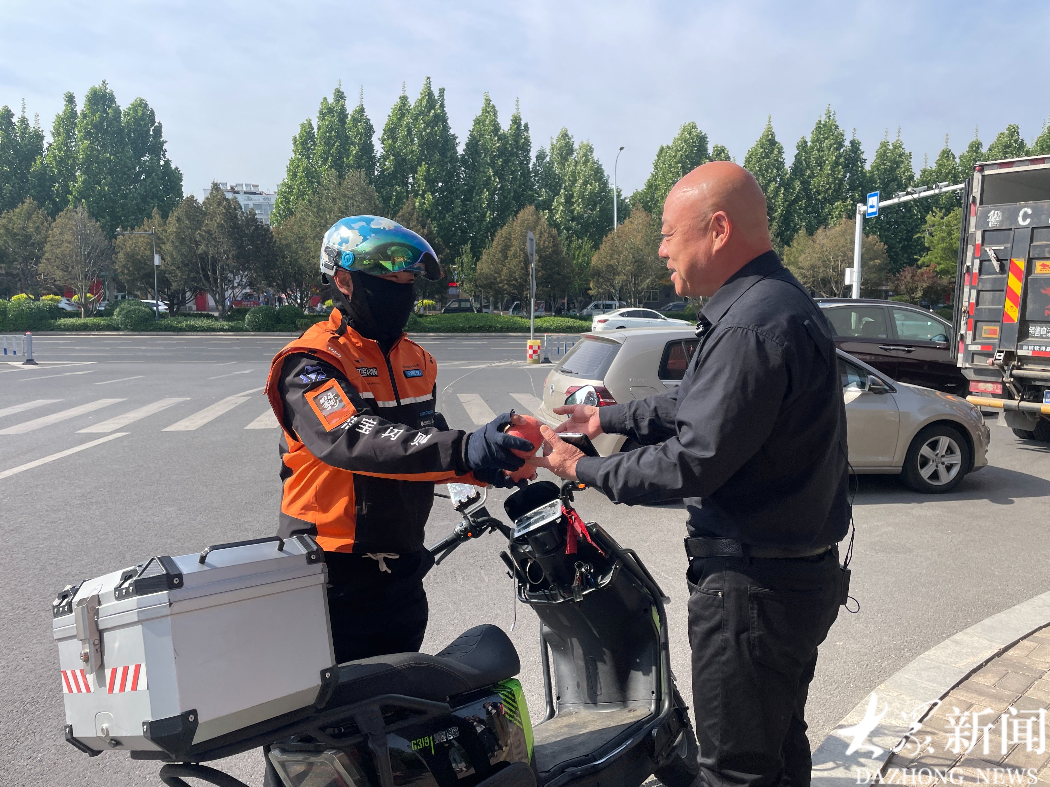 ▲4月28日,邵涛(右)给外卖小哥送去爱心苹果。
