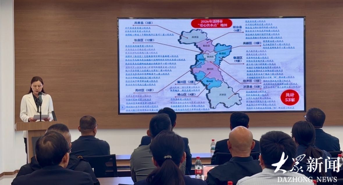 现场发布的2026年淄博市“爱心饮水点”电子地图,共计53家“爱心饮水点”。从张店到临淄,从沂源到高青,覆盖了整座城市。