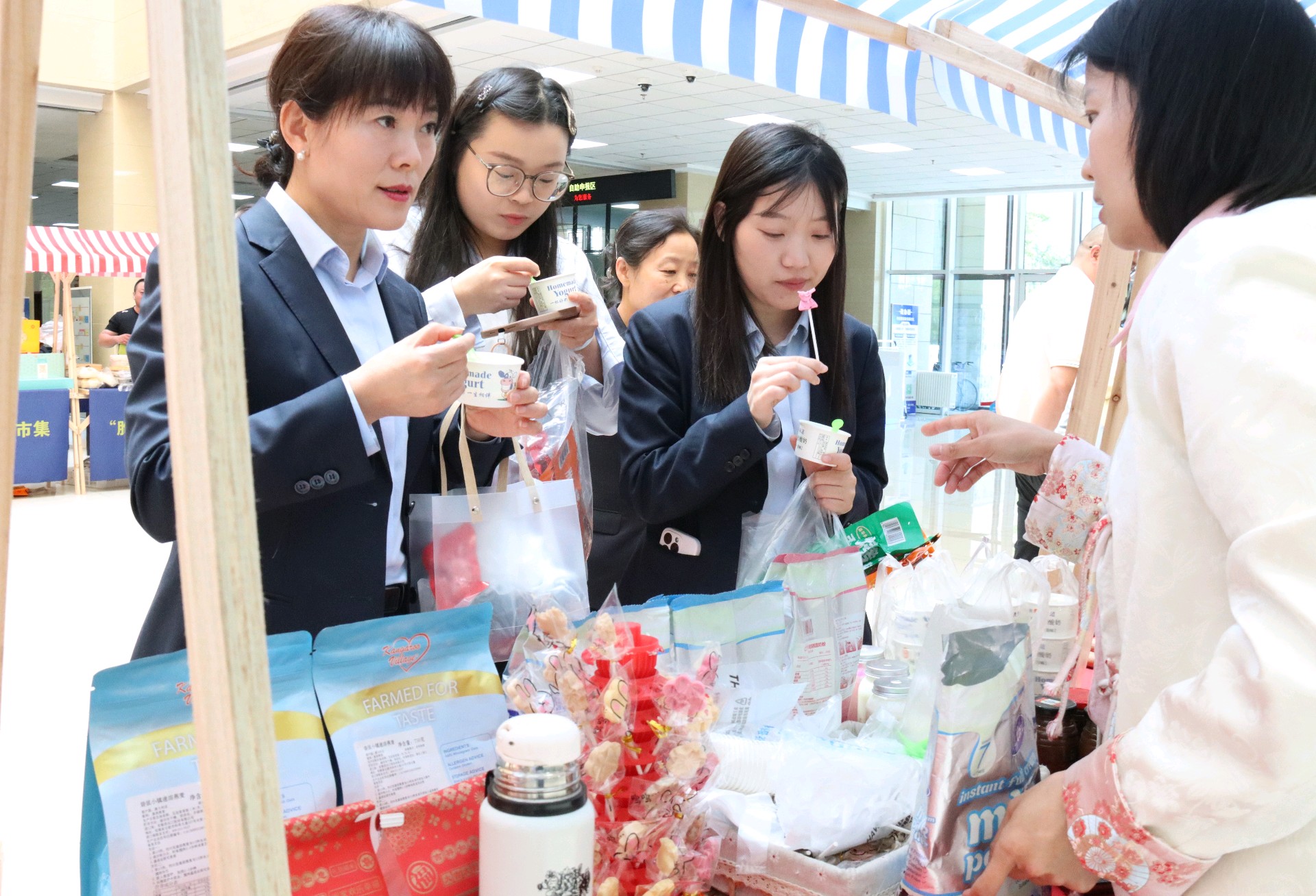 活动现场,政务大厅变身便民“好物市集”,食品流通、非遗文化、医养产品等多个领域的优质企业集中亮相,展位整齐排列,产品琳琅满目,吸引众多办事群众驻足观看、试吃体验、购买消费,互动氛围热烈。现场还设置了政策宣讲、咨询指导等专区,让办事群众在逛展之余,了解政务服务业务流程与惠企便民举措。