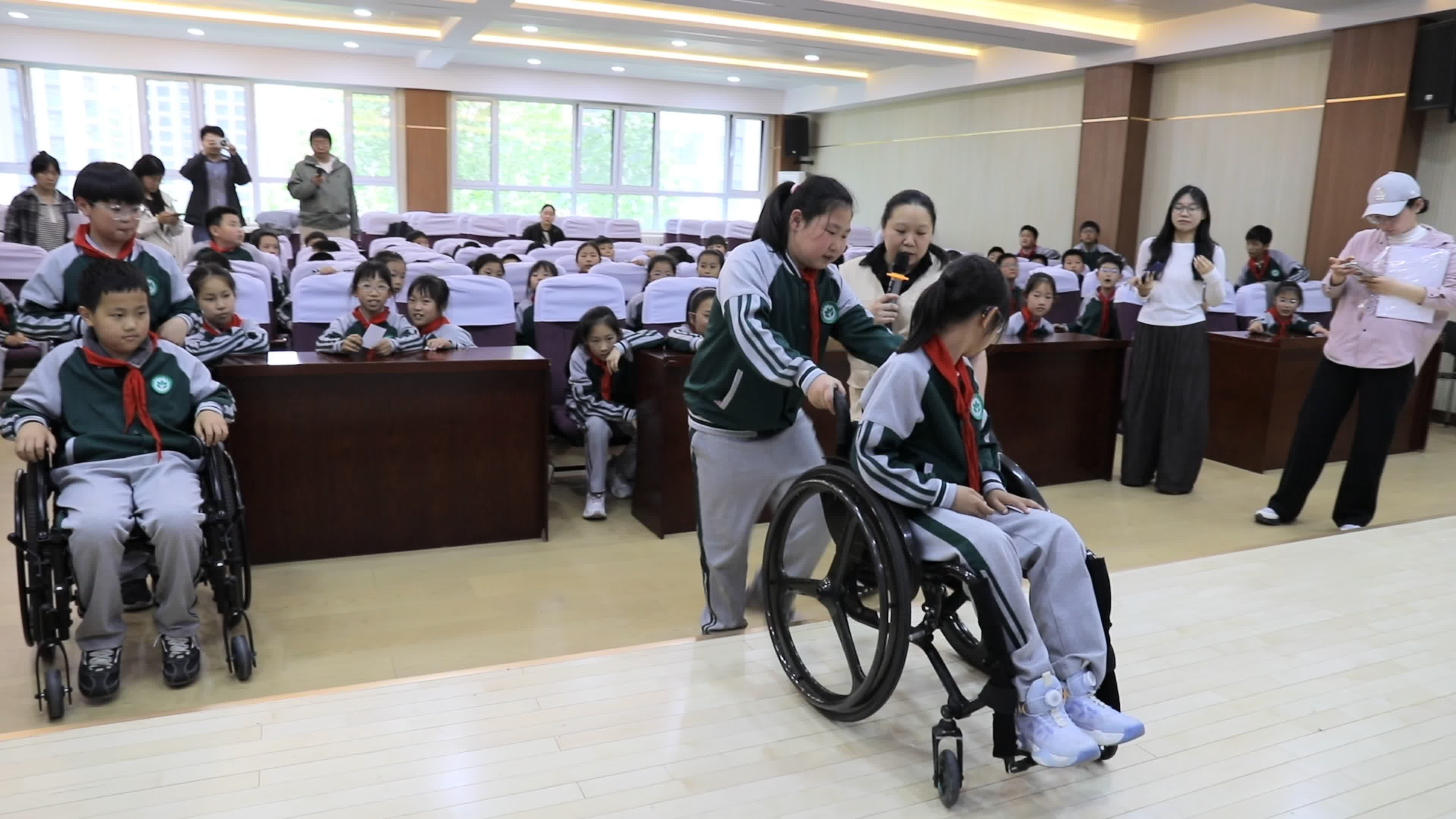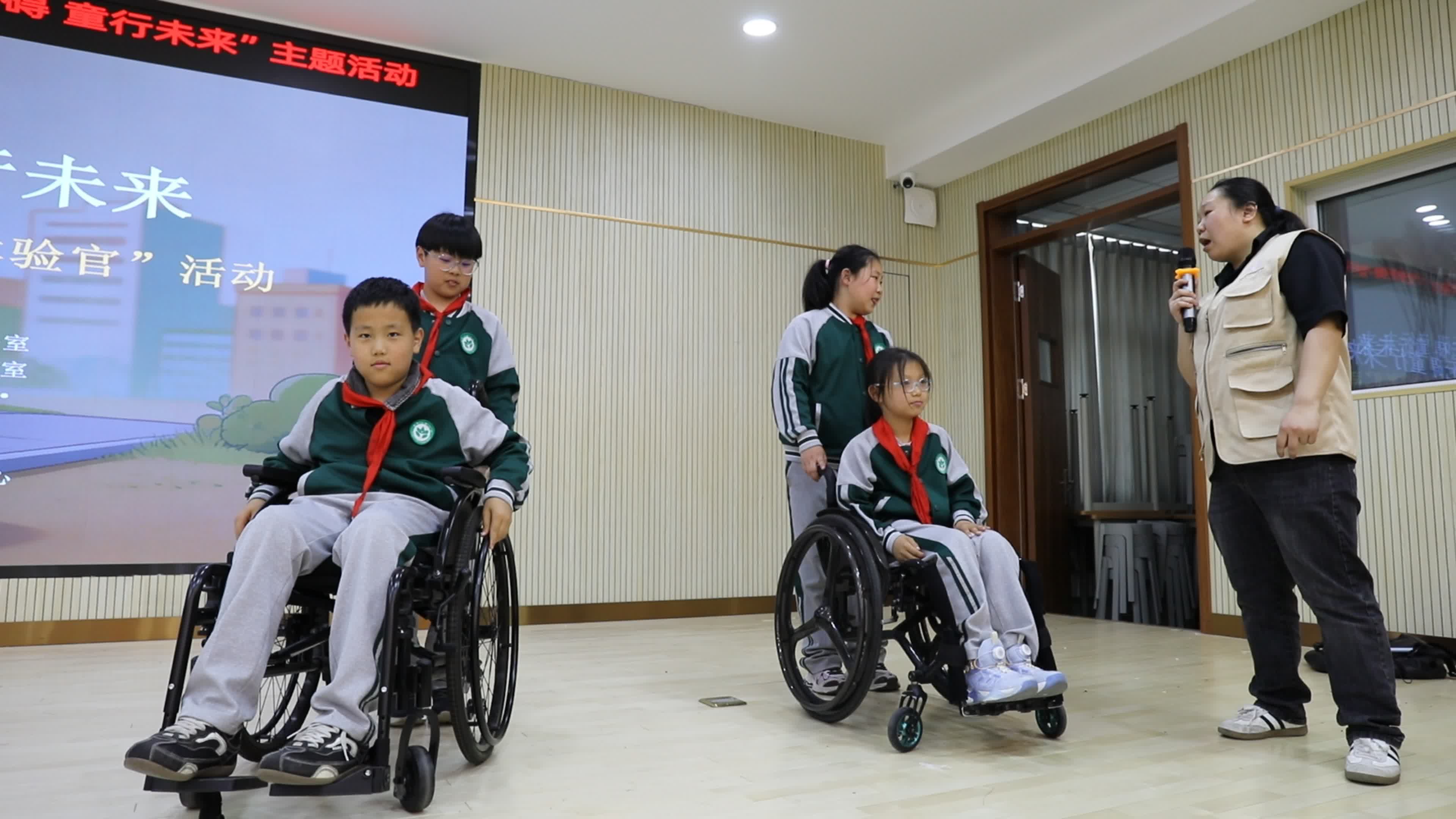 轮椅体验同样令人震撼。孩子们坐上轮椅,试图通过窄门和坡道。原本轻松的动作变得异常吃力。孩子们明白了,原来一个小小的台阶,对轮椅伙伴来说就是一座山。