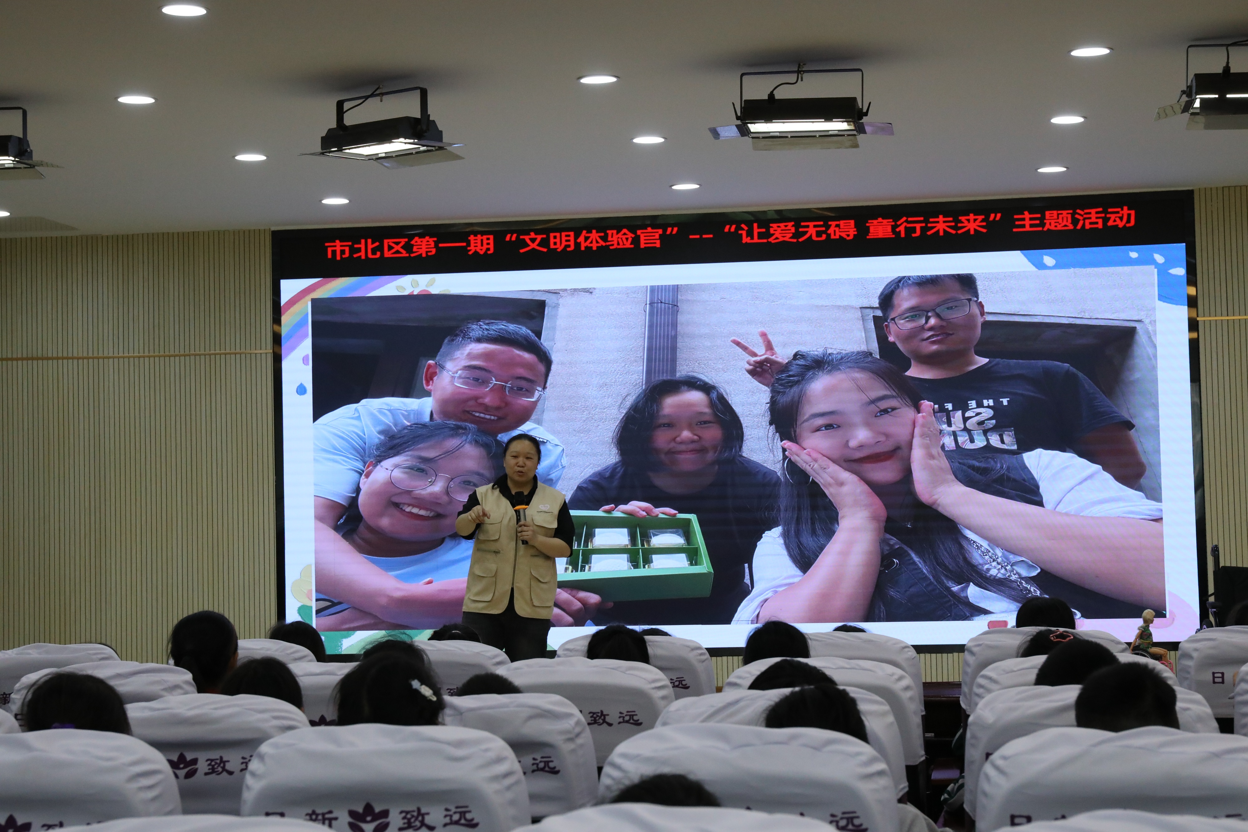 讲台上的人叫崔雅梦。她是青岛市“文明市民”,也是青岛唯爱公益慈善服务中心的执行主任。她把自己的40平方米Loft公寓改造成免费无障碍民宿“雅梦小家”,这件事曾被央视等多家媒体报道过。