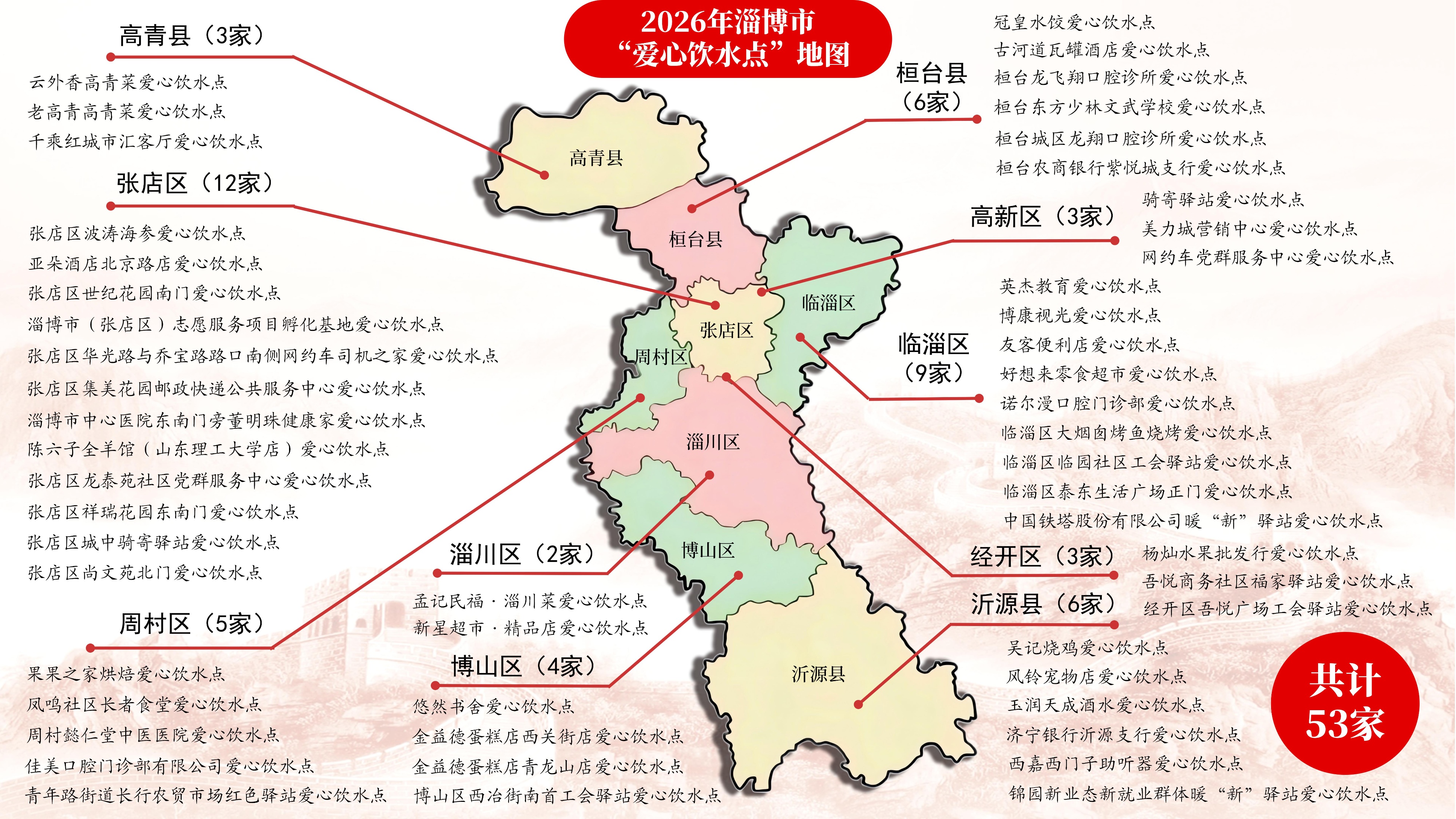 附:2026年淄博市“爱心饮水点”地图名单(53家)