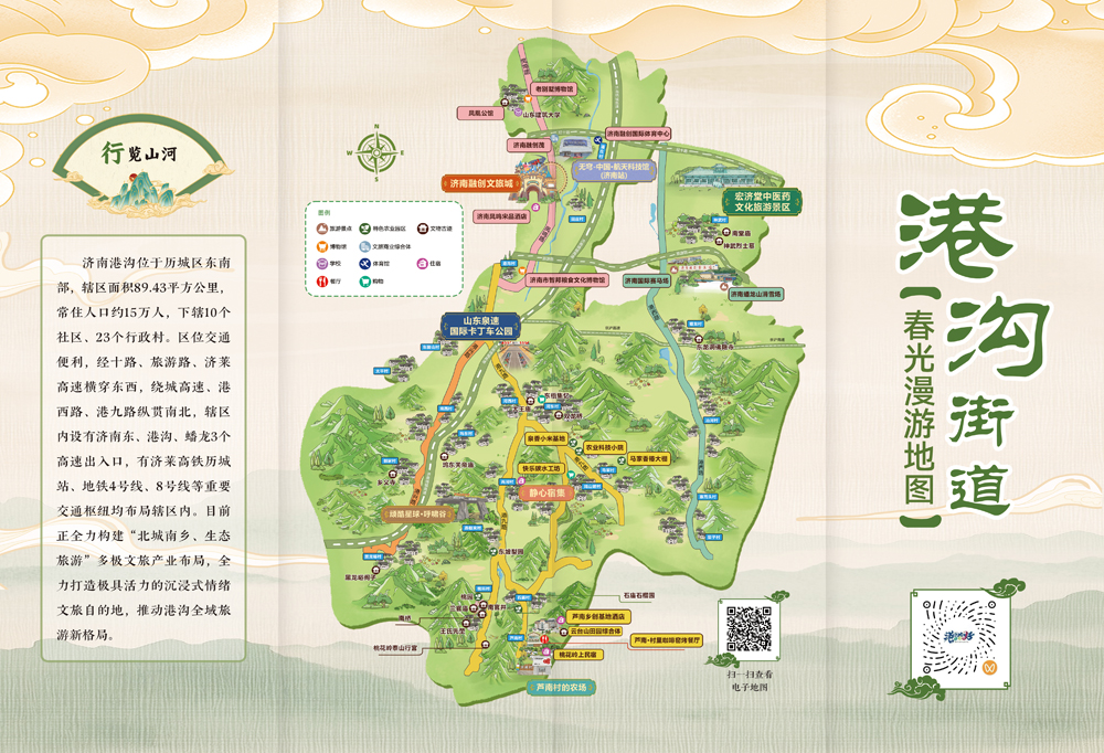 港沟春光漫游图通过AI地图沉浸式呈现全域文旅版图,清晰展示8大特色园区、30项主题活动的游玩路线与亮点玩法。