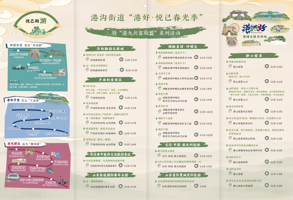为全方位满足游客多元情绪体验需求,历城区港沟街道依托辖区优质自然禀赋,精心打造悠然乡村游、匠心工业游、活力都市游三条特色线路,构建“康养疗愈+都市解压+田园治愈”三位一体产品体系,从踏青研学、亲子互动到康养休闲,让广大市民游客在山水间释放压力、愉悦身心,在文化浸润中收获美好。