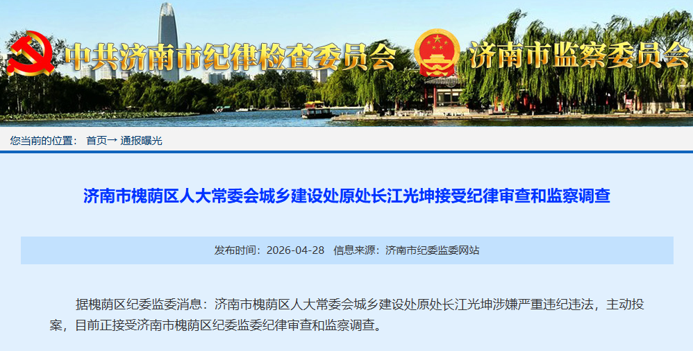 4月28日,济南市纪委监委通报:据槐荫区纪委监委消息:济南市槐荫区人大常委会城乡建设处原处长江光坤涉嫌严重违纪违法,主动投案,目前正接受济南市槐荫区纪委监委纪律审查和监察调查。