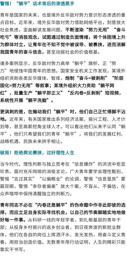 当“卷不动就躺平”频繁见诸网络,当“摆烂是最优解”反复刷屏,身处舆论场的青年难免陷入迷茫。但面对扑面而来的消极情绪,我们必须擦亮双眼、保持清醒,警惕这些看似平常的“躺平”论调背后暗藏的复杂舆论陷阱。