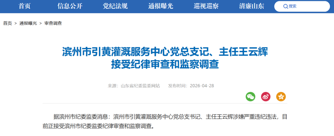 4月28日,据滨州市纪委监委消息:滨州市引黄灌溉服务中心党总支书记、主任王云辉涉嫌严重违纪违法,目前正接受滨州市纪委监委纪律审查和监察调查。