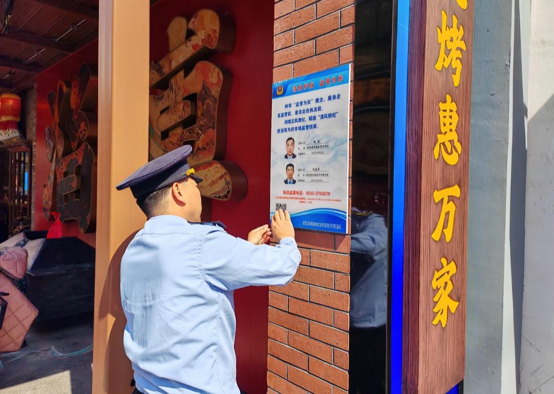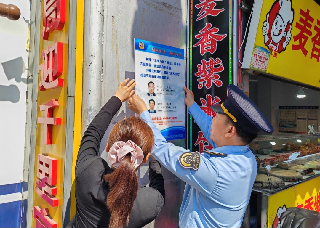 张店区市场监管局印制监督公示牌,在八大局入口处及辖区重点烧烤店等人员密集、消费集中的场所显著位置张贴,打通群众监督“最后一公里”。公示牌内容简洁明了、重点突出,成为群众身边的“监督岗”和执法人员的“警示牌”,具体包含两大内容:一是明确公示辖区负责该区域食品安全监管的工作人员姓名、联系电话,实现“监管责任到人、联系直达高效”,群众遇到食品安全疑问、发现违法违规线索时,可直接联系对应监管人员,实现快速响应、及时处置;二是清晰标注纪委监委举报网址和举报电话,畅通群众监督渠道,鼓励群众积极参与监督,对执法人员不作为、慢作为、乱作为,以及滥用职权、徇私枉法等违反“清风铁纪”要求的行为进行举报,确保执法队伍作风建设始终处于群众监督之下。