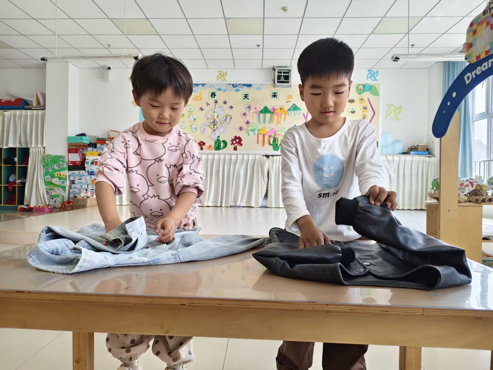 中班幼儿化身“班级小帮手”,讨论了解各行各业劳动者,主动完成擦桌椅、整理绘本等班级劳动,还通过自理能力比拼、劳动工具DIY等活动,提升劳动技能,增强集体责任意识。