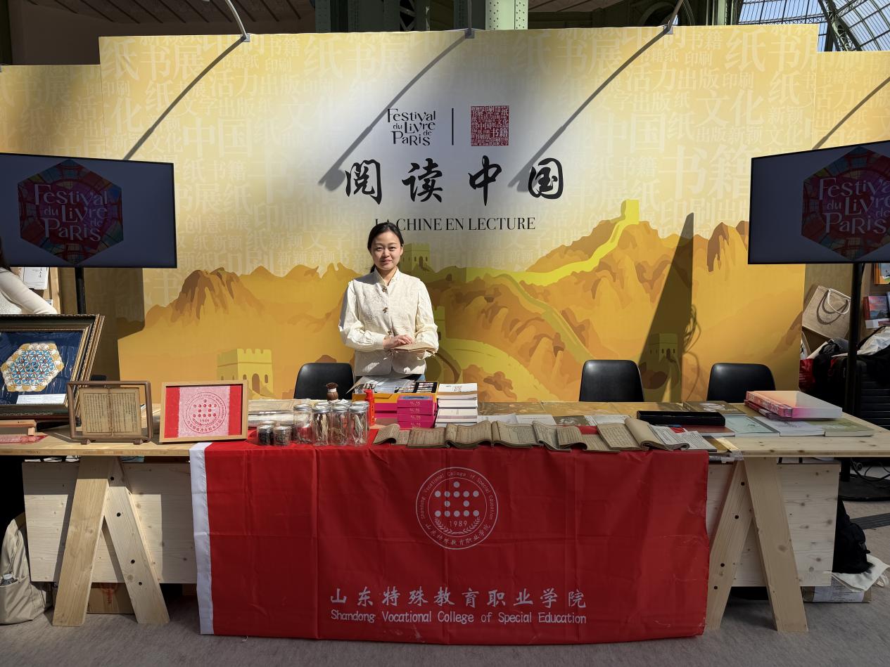 山东特殊教育职业学院艺术设计系文物修复与保护专业教师马晓钰代表学院参展,将听障学生古籍修复项目带到2026年巴黎图书节学院“古韵新声:听障学生古籍修复技艺巴黎展示”现场。