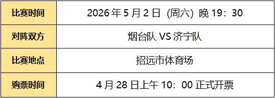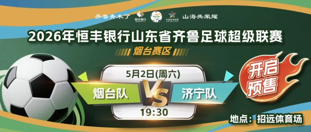 齐鲁超赛烟台赛区首战的声浪还在回荡,下一程的号角已经吹响。5月2日,烟台队将坐镇招远市体育场迎战济宁队。目前比赛门票已正式开售,赶紧抢票,亲临现场为家乡球队呐喊助威。购票链接二维码:赛事信息:购票优惠:大众新闻·齐鲁壹点钟建军
