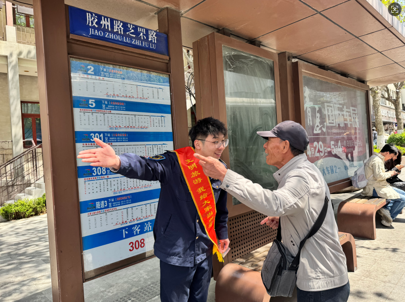 在这场志愿服务行动中,5支“青岛巴士”志愿服务团队,在铁路枢纽、核心景区、高校周边等30余个客流密集站点设置志愿服务点,近200名党员干部、青年志愿者身披“青岛巴士志愿服务”绶带,走上站头一线,将公交站点打造成集交通指引、文旅咨询、文明引导于一体的综合服务站。