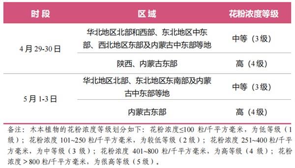 经综合研判,4月29日至30日,华北地区北部和西部、东北地区中东部、西北地区东部及内蒙古中东部等地的花粉浓度处于中等级(3级),部分地区花粉浓度处于高等级(4级);5月1日至3日,华北地区北部、东北地区东南部及内蒙古中东部等地的花粉浓度处于中等级(3级),部分地区花粉浓度处于高等级(4级)。