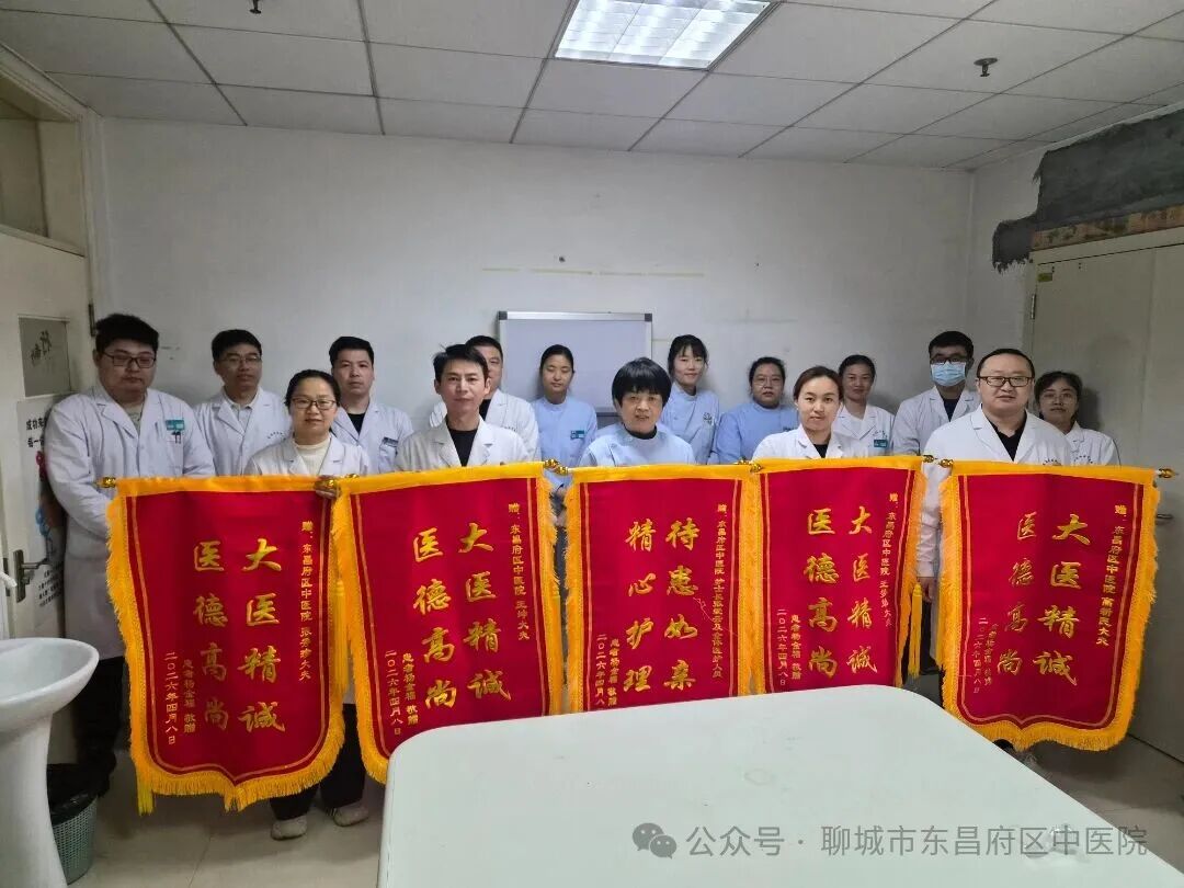 4月9日清晨,聊城市东昌府区中医院,正值医护交接班时分,住院患者杨先生携家属来到护士站,将手里沉甸甸的五面锦旗,分别赠予他的责任医生、康复治疗师以及全体医务人员。
