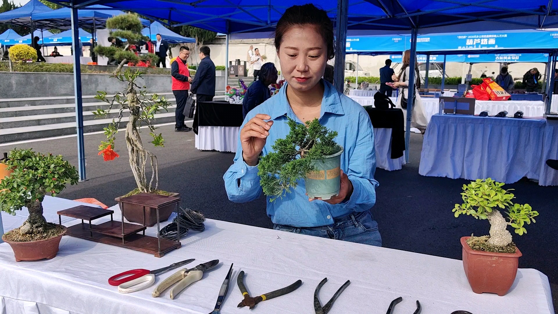 在非遗手造展区,80后新农人宋汀正悉心修剪一盆手掌大小的微型石榴盆景,姿态虬劲。她告诉记者,自己做微型盆景20多年了,打理着15亩园子,专做榔榆、火棘、黄杨等品种,已是市级非遗。