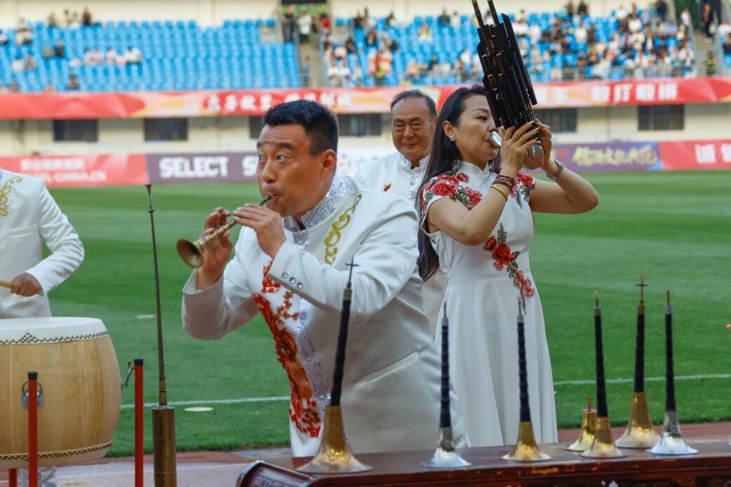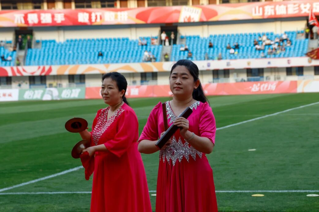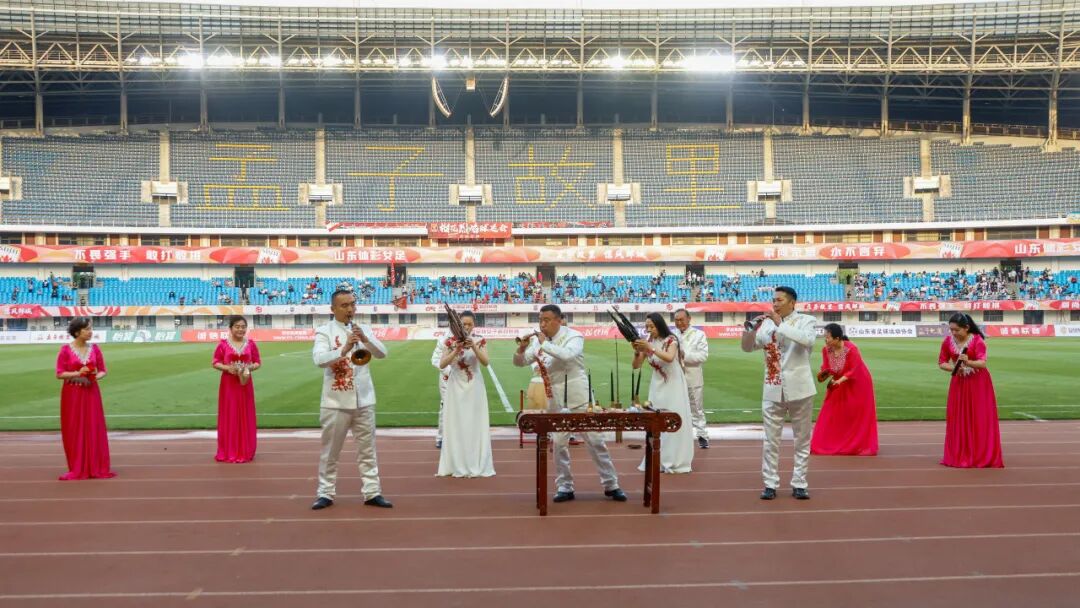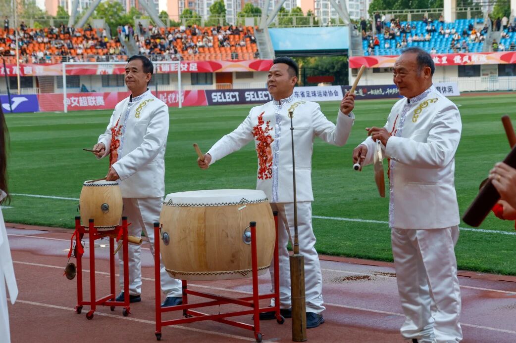 演奏团队倾情献艺,经典曲目激昂豪迈、气势如虹,用最地道的邹城声音,为女足加油、为联赛喝彩,让全国观众通过赛场,听见邹城非遗、记住邹城魅力。