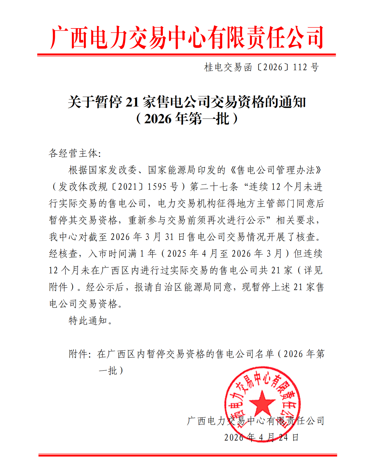 4月24日,广西电力交易中心发布关于暂停21家售电公司交易资格的通知 (2026年第一批)。铁塔能源有限公司广西分公司在此次暂停名单当中。文件显示,此次暂停原因为入市时间满1年(2025年4月至2026年3月)但连续12个月未在广西区内进行过实际交易。
