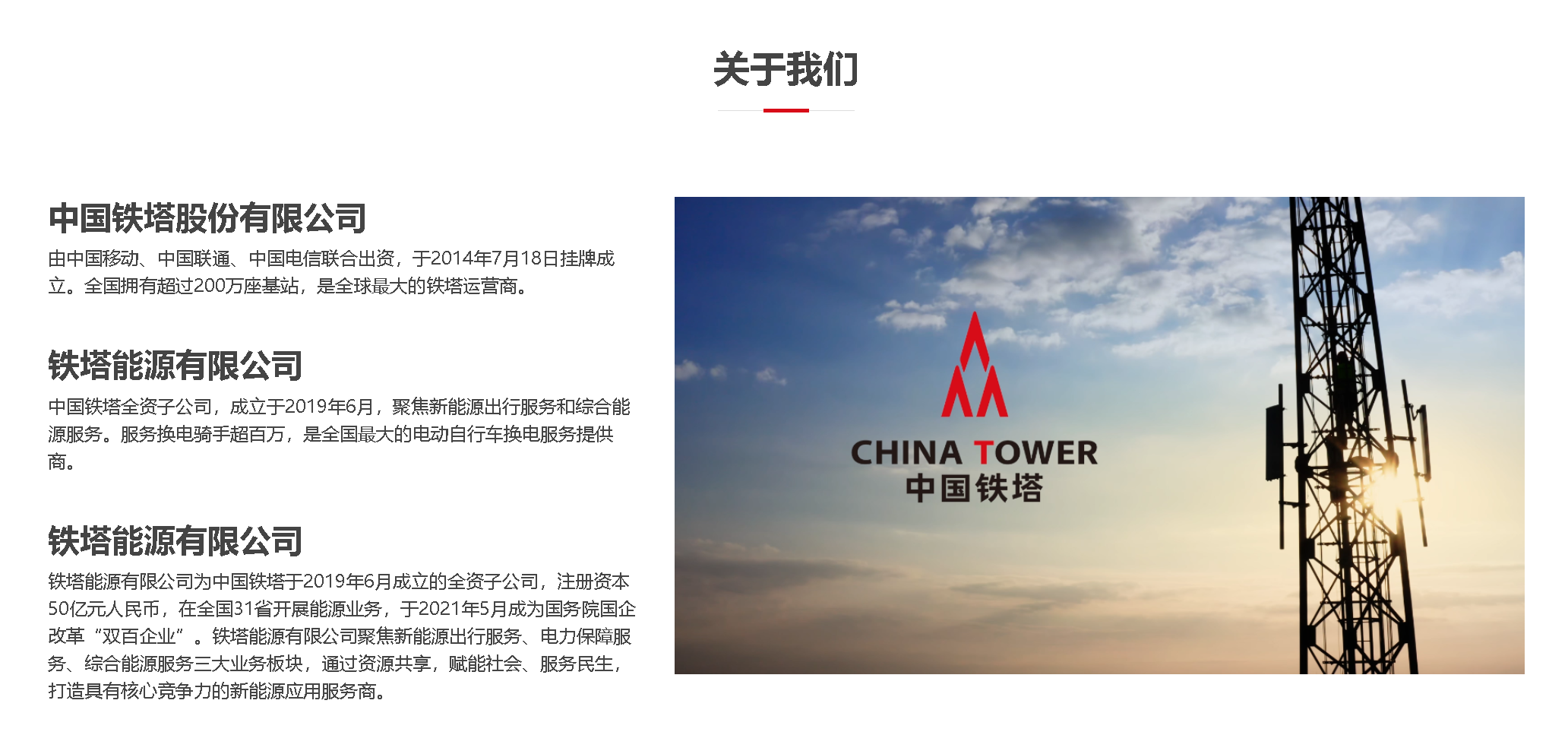 铁塔能源有限公司为中国铁塔于2019年6月成立的全资子公司,注册资本50亿元人民币,在全国31省开展能源业务,于2021年5月成为国务院国企改革“双百企业”。铁塔能源有限公司聚焦新能源出行服务、电力保障服务、综合能源服务三大业务板块。