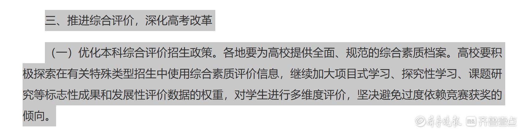 综评乱象也已经引起监管层的重视。2025年山东省教育厅综招通知已明确要求“淡化学科竞赛导向”,引导高校减少对竞赛证书的依赖。两年之后,2026年综招简章将这一要求升级为“全面取消”,这既是对教育部精神的呼应,也是山东直面竞赛证书乱象的果断回应。