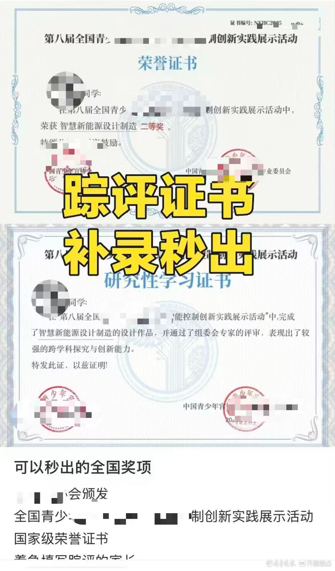 作为过程性、参考性评价方式,综合评价本是记录学生成长、发现闪光点的育人工具,一旦从“成长档案”变成“升学筹码”,价值便从“热爱”异化为“功利工具”。一批机构从中看到商机,以低门槛、高获奖率为噱头,举办含金量低下的竞赛,收取报名费、证书费乃至“包奖费”。记者调查发现,有的中介机构甚至通过“挂名”和“项目整体售卖”方式,公然在网上为参赛学生明码标价出售国家级赛事奖项,价格从数千元至数万元不等。