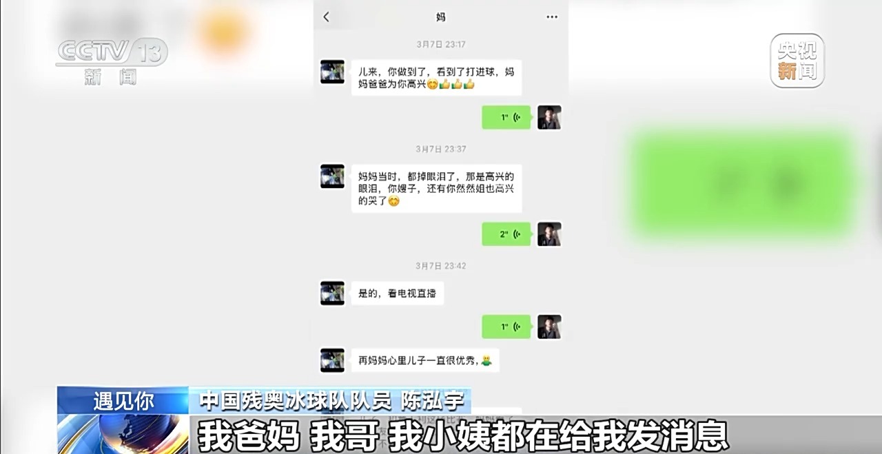 中国残奥冰球队队员 陈泓宇:我记得最清楚的是第一场打德国的时候,我进了一个球。我们比完赛,我回去一拿手机看到爸妈、我哥、小姨都在给我发消息,说“你真棒”。那一刻就感觉那么多年努力没白练,没做错选择。