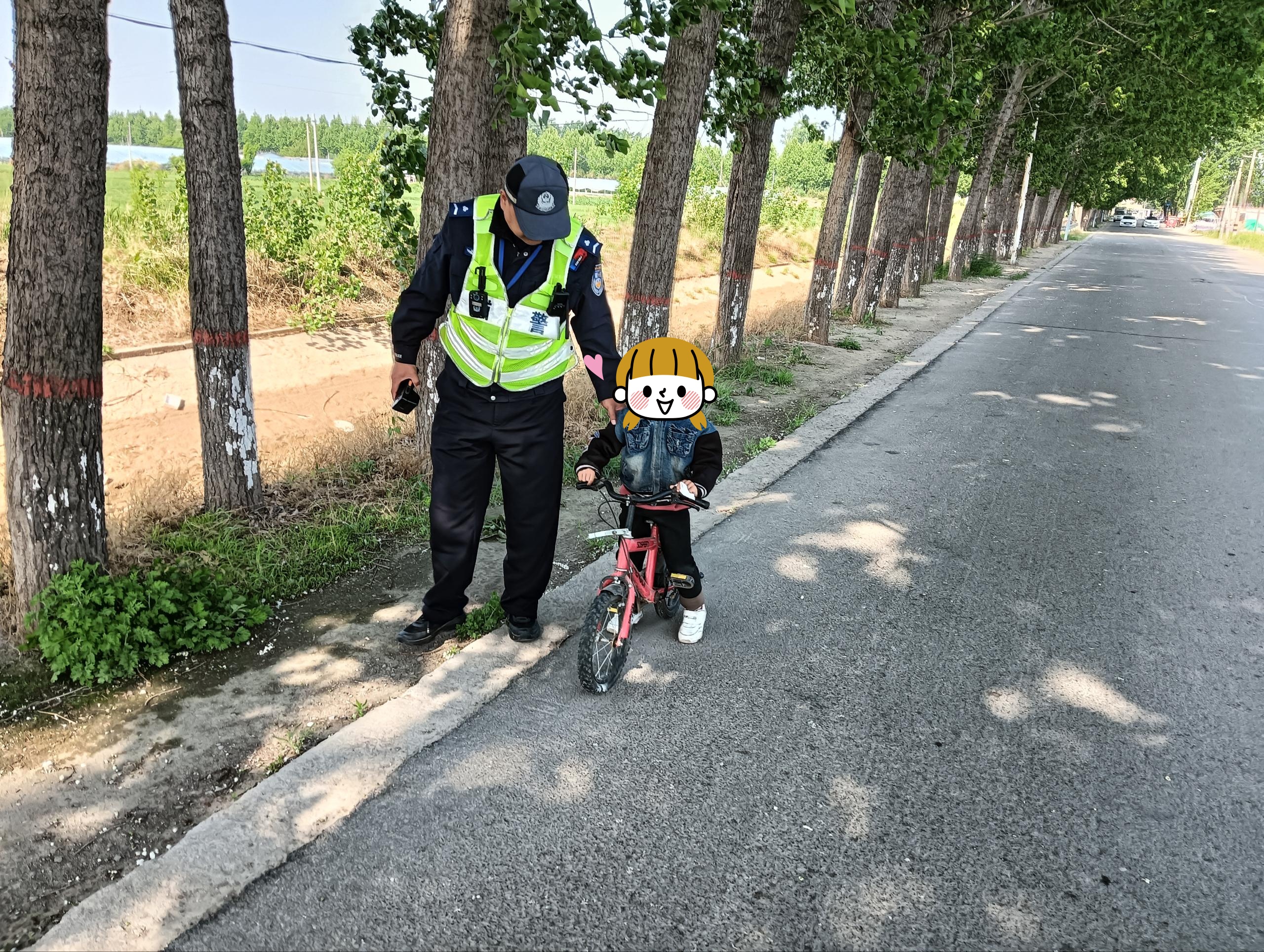 近日,聊城开发区交管大队聊夏中队民辅警在开展日常勤务工作时,发现一名骑着脚踏车的女童独自徘徊,身边无家人陪同,周边田间农机、往来车辆较多,孩童独处野外路旁隐患突出,民警当即上前询问。