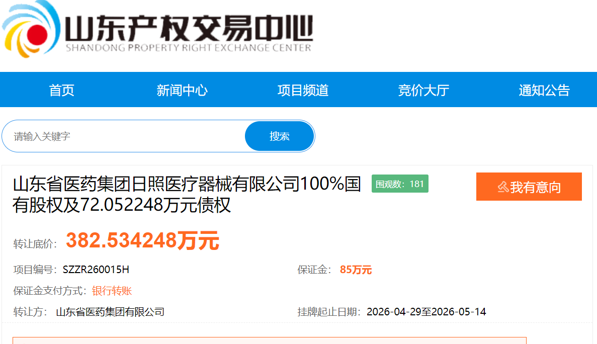 4月29日,山东省医药集团日照医疗器械有限公司(下称“日照医疗器械公司”)100%国有股权及72.05万元债权在山东产权交易中心挂牌转让,转让底价382.53万元,转让方为山东省医药集团有限公司(下称“省医药集团”),挂牌起止日期为4月29日至5月14日。