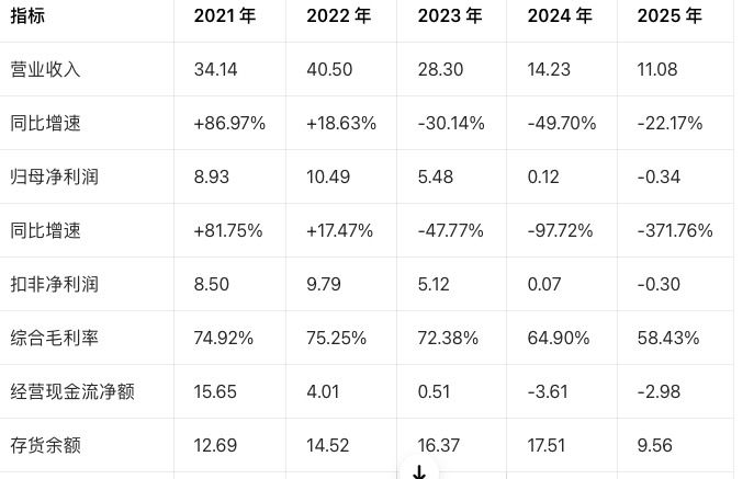 另一方面,利润由盈转亏:2024年盈利 1249 万元,2025年巨亏 3395 万元,扣非净利润同比下滑 545.77%,主营业务盈利能力彻底枯竭。