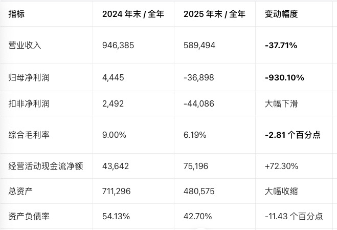 2025年一季度营收 28.52 亿元,归母净利润 0.85 亿元,为全年唯一盈利季度;二季度营收 10.97 亿元,归母净利润 - 0.24 亿元,由盈转亏;三季度营收 12.14 亿元,归母净利润 - 2.55 亿元,创上市以来最差单季业绩;四季度营收仅 7.32 亿元,同比 - 55.2%、环比下降64.5%,毛利率 - 5.45%,为公司历史首次单季毛利率为负。