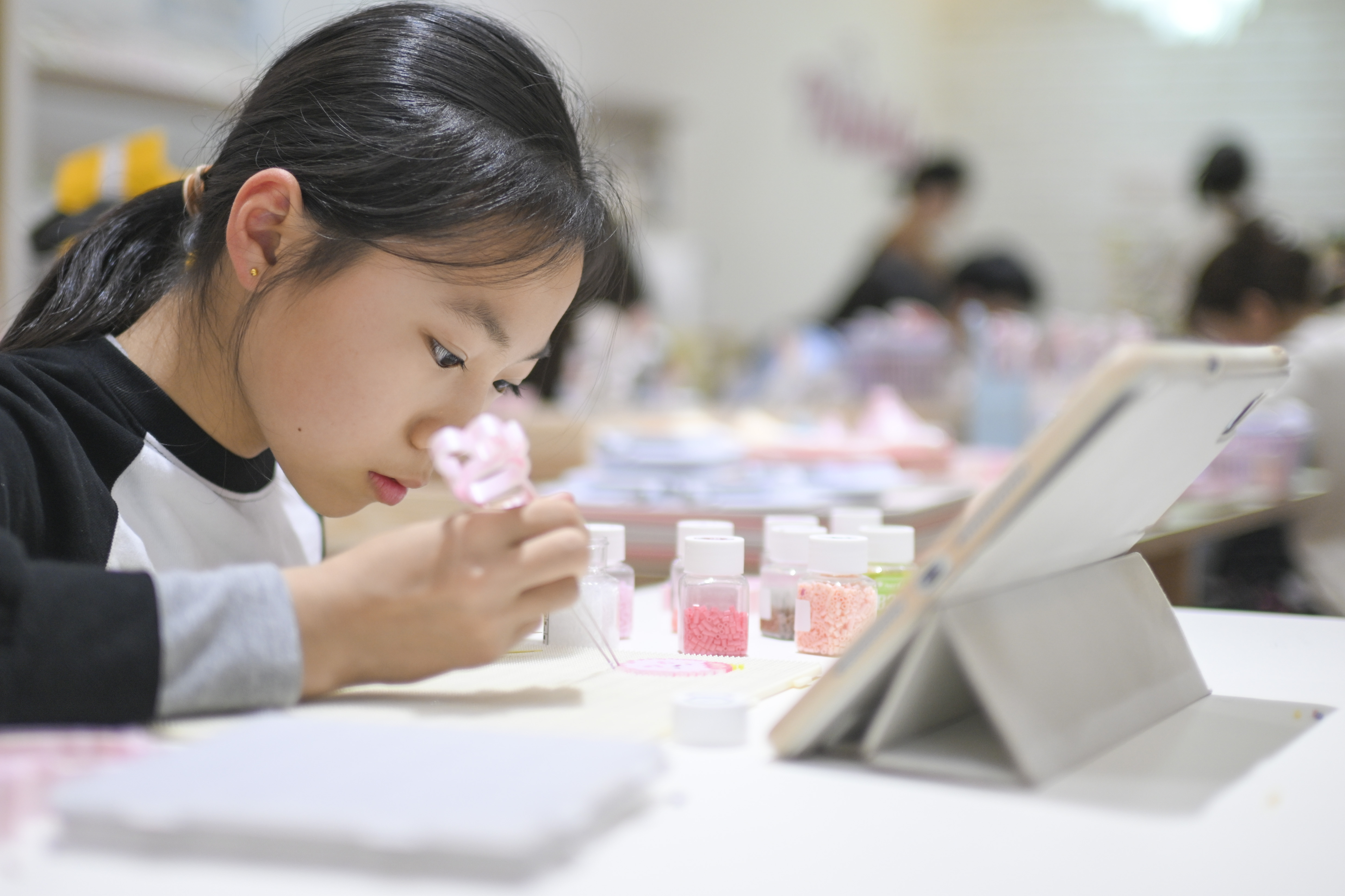 4月13日,小朋友在江苏省昆山市一家“拼豆”手工坊拼豆。(新华社发)