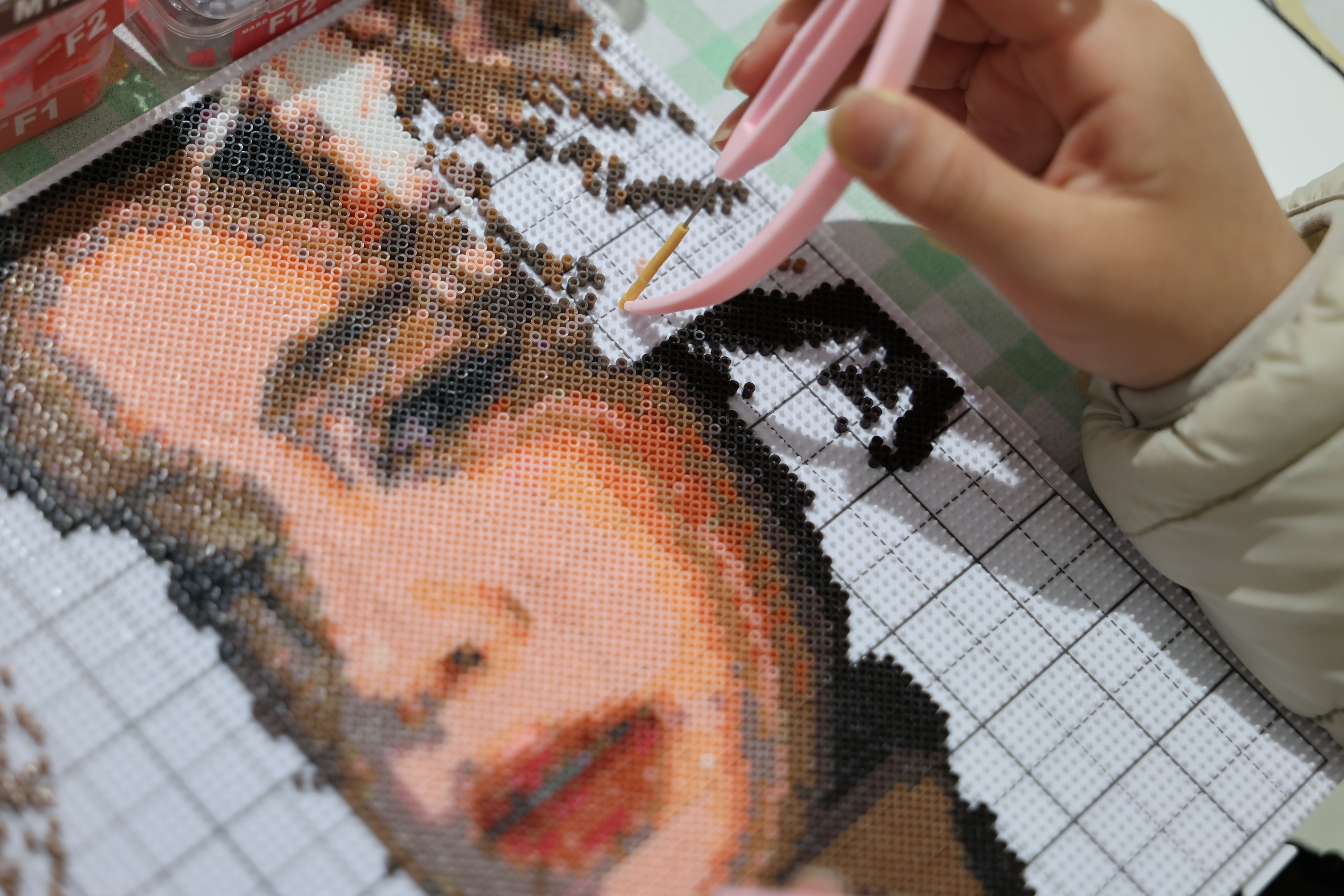 2个月前,她在朋友陈日雯的提议下第一次走进这里,如今已经成了常客,“我没有手工基础,也尝试过陶艺、立体油画,但那些项目工序复杂、容易失败。相比之下,拼豆几乎没有门槛,只要把豆子一颗颗放进去,就能看到效果,这种感觉很上瘾。”