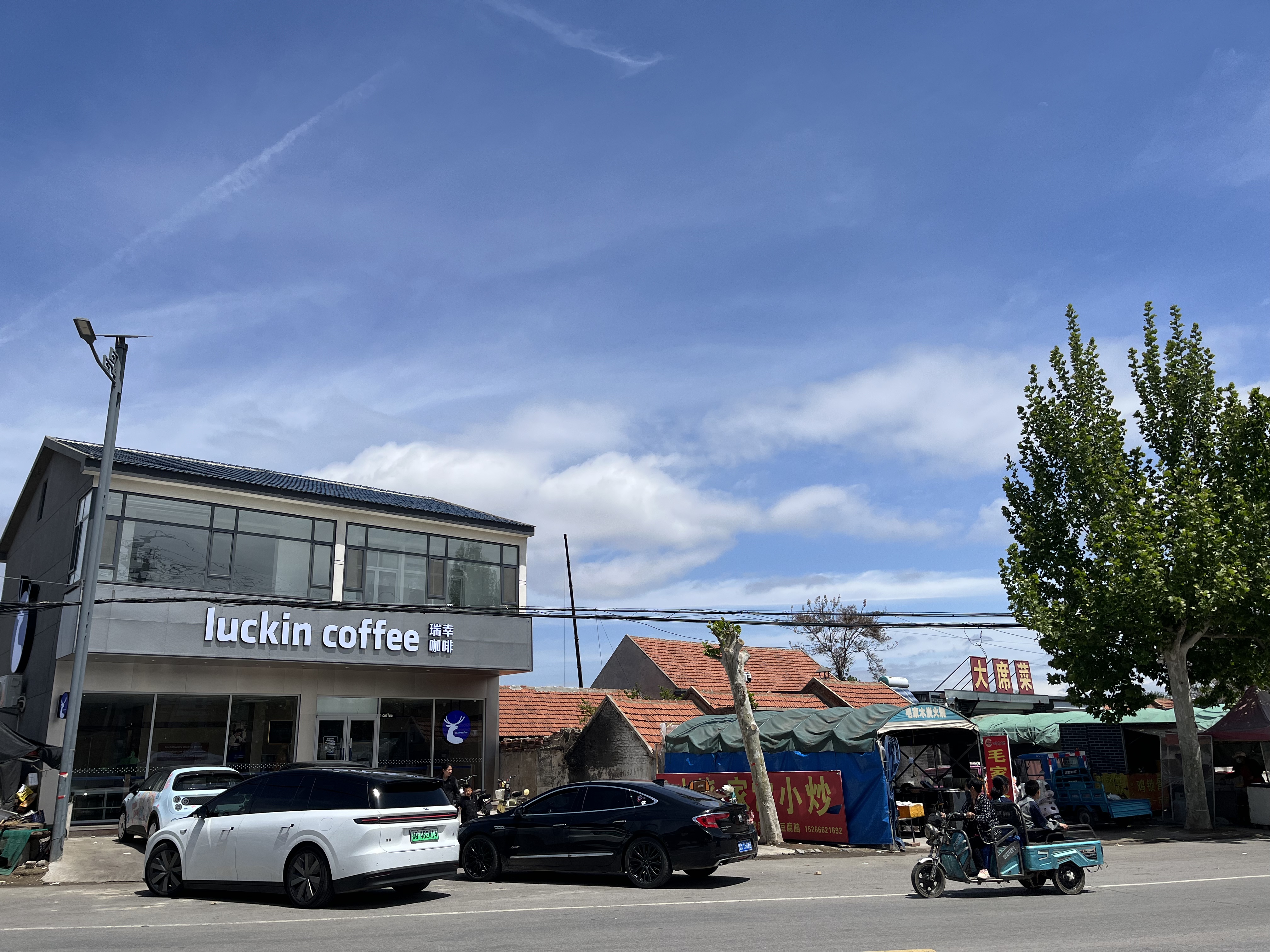 4月28日,距离平邑县仲村镇五公里外的汶泗公路上,两旁的果树苗木郁郁葱葱。行车10分钟抵达镇中心,街边却是另一番景象:炸油条、大席菜、农家风味菜馆,以及一栋与这些乡土气息格格不入的“瑞幸咖啡”二层小楼。