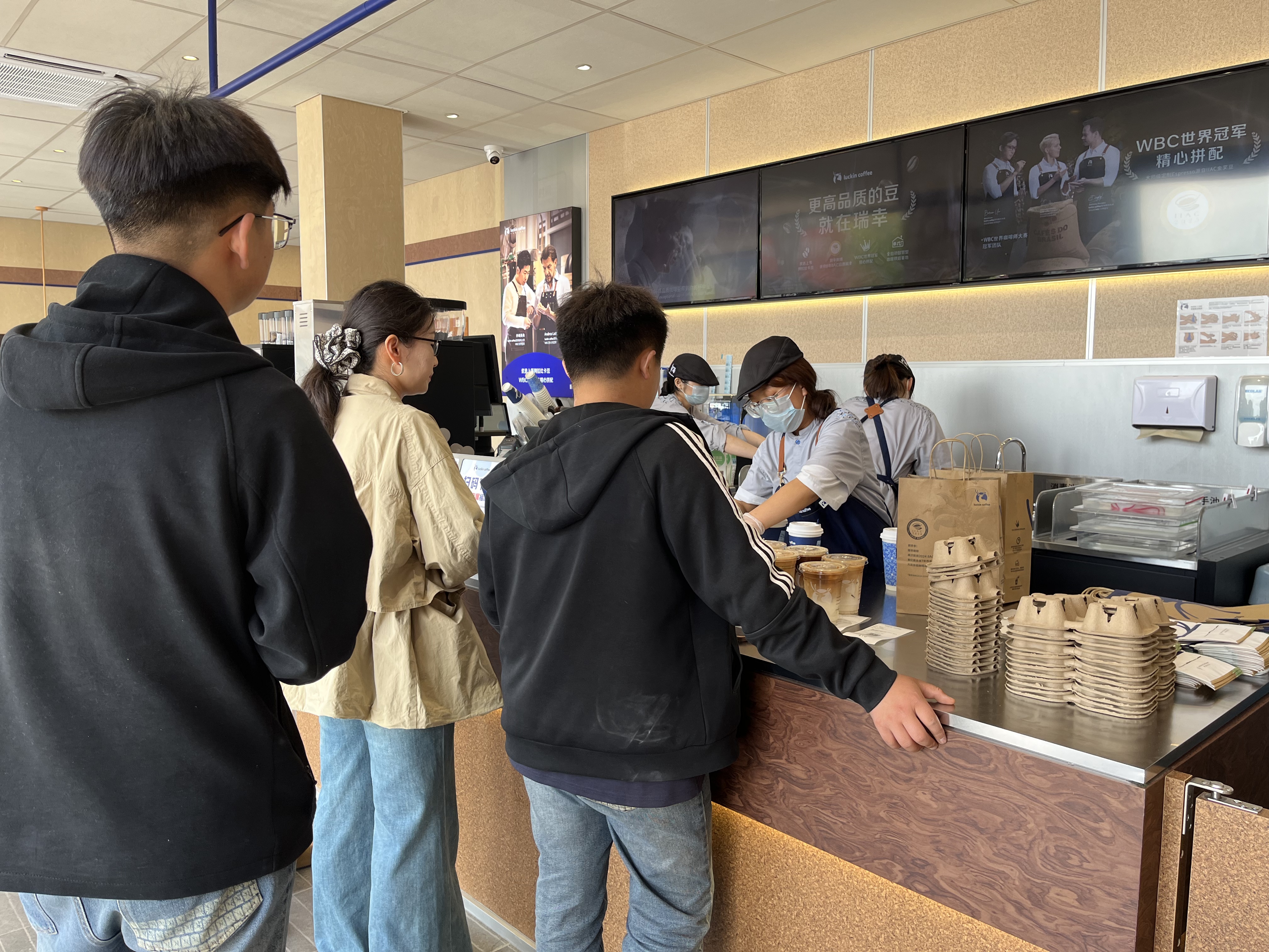 晌午的日头正盛,咖啡店的玻璃门被推开又合上。吧台后的咖啡机没停下过,几名店员手里的奶缸不停晃动打制绵密奶泡,装杯、扣盖、装袋,整套流程下来两三分钟,面前的取餐台很快就摞起了一排待取的订单。