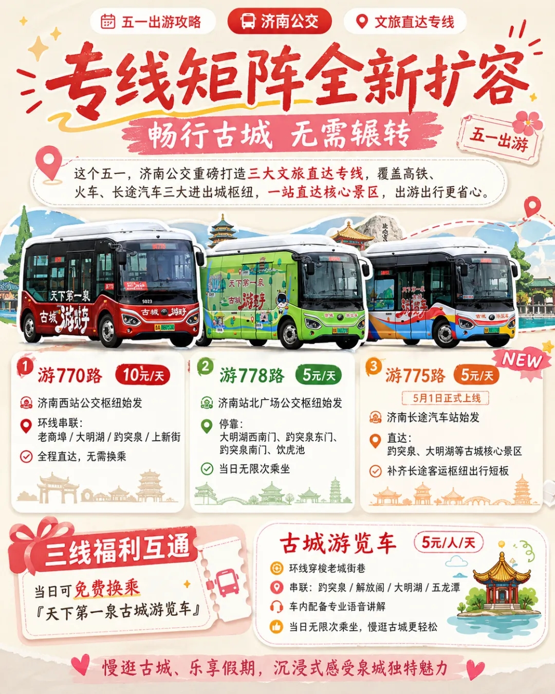 春风十里赴泉城,美好“五一”正当时!“五一”小长假将至,为全力满足广大市民游客出游需求,深化公交+文旅融合发展,济南公交全面升级文旅出行服务矩阵,扩容景区专线、优化出行网络、叠加惠民福利,邀八方宾客乘公交、逛古城、赏泉韵,一张车票轻松解锁泉城绝美风光!