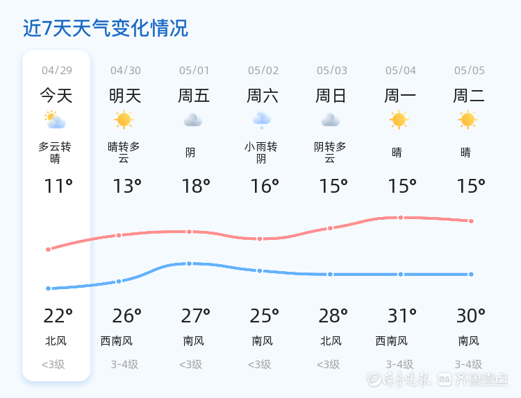 今天是4月29日,星期三,农历三月十三。枣庄市今天天气多云转晴,白天气温适宜,最高气温22℃,最低气温11℃。东风1级,空气湿度76%,PM2.5指数53,空气质量良好。各区天气情况基本一致,整体以多云转晴为主,适合市民户外活动。