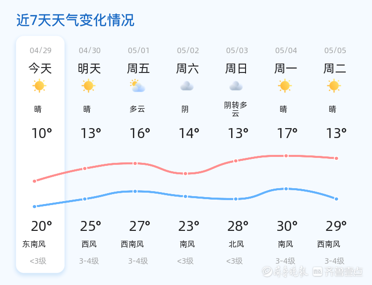 今天是4月29日,星期三,农历三月十三。临沂市迎来晴朗天气,北风2级,气温在10℃至20℃之间。目前温度为11.9℃,空气湿度65%,PM2.5指数为44,空气质量良好。各区天气情况一致,均为晴朗天气,适宜户外活动。