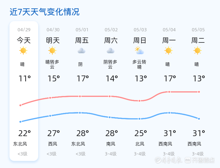 明天4月30日,潍坊市天气将由晴转多云,气温较今日有所上升,预计最高气温为27℃,最低气温为15℃。风向转为西风,风力仍为<3级,整体天气较为舒适。