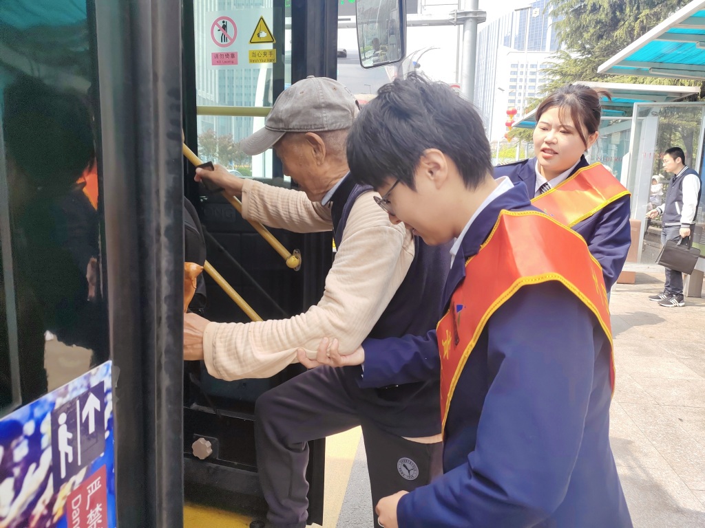 “青岛巴士”青年志愿者在五四广场附近站点提供帮扶服务